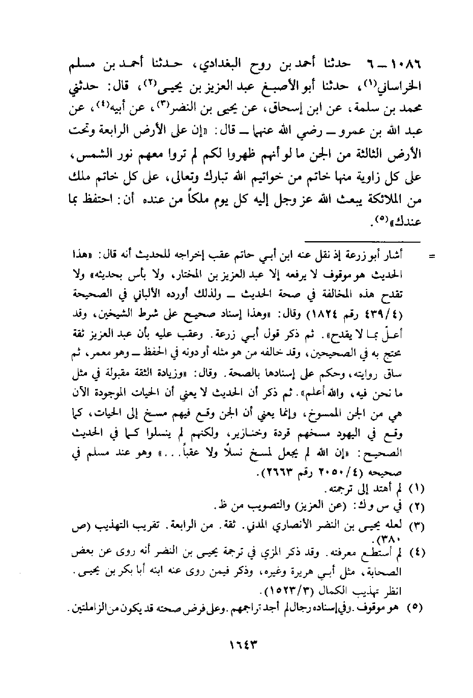 حَدَّثَنَا أَحْمَدُ بْنُ رَوْحٍ الْبَغْدَادِيُّ، حَدَّثَنَا أَحْمَدُ بْنُ مُسْلِمٍ الْخُرَاسَانِيُّ، حَدَّثَنَا أَبُو الْأَصْبَغِ عَبْدُ الْعَزِيزِ بْنُ يَحْيَى قَالَ: حَدَّثَنِي مُحَمَّدُ بْنُ سَلَمَةَ، عَنِ ابْنِ إِسْحَاقَ، عَنْ يَحْيَى بْنِ النَّضْرِ، عَنْ أَبِيهِ، عَنْ عَبْدِ اللَّهِ بْنِ عَمْرٍو رَضِيَ اللَّهُ عَنْهُمَا قَالَ: §«إِنَّ عَلَى الْأَرْضِ الرَّابِعَةِ وَتَحْتَ الْأَرْضِ الثَّالِثَةِ مِنَ الْجِنِّ مَا لَوْ أَنَّهُمْ ظَهَرُوا لَكُمْ، لَمْ تَرَوْا مَعَهُمْ نُورَ الشَّمْسِ، عَلَى كُلِّ زَاوِيَةٍ مِنْهَا خَاتَمٌ مِنْ خَوَاتِيمِ اللَّهِ تَبَارَكَ وَتَعَالَى، عَلَى كُلِّ خَاتَمٍ مَلَكٌ مِنَ الْمَلَائِكَةِ يَبْعَثُ اللَّهُ عَزَّ وَجَلَّ إِلَيْهِ كُلَّ يَوْمٍ مَلَكًا مِنْ عِنْدِهِ أَنِ احْتَفِظْ بِمَا عِنْدَكَ»