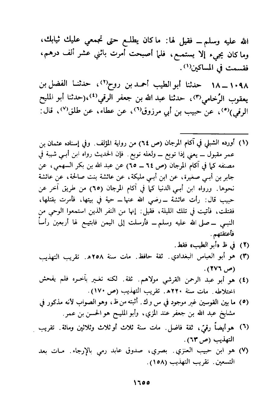 حَدَّثَنَا أَبُو الطَّيِّبِ أَحْمَدُ بْنُ رَوْحٍ، حَدَّثَنَا الْفَضْلُ بْنُ يَعْقُوبَ الرُّخَامِيُّ، حَدَّثَنَا عَبْدُ اللَّهِ بْنُ جَعْفَرٍ الرَّقِّيُّ، حَدَّثَنَا أَبُو الْمَلِيحِ الرَّقِّيُّ، عَنْ حَبِيبِ بْنِ أَبِي مَرْزُوقٍ، عَنْ عَطَاءٍ، عَنْ طَلْقٍ قَالَ -[1656]-: " كُنْتُ عِنْدَ أَبِي عَبَّاسٍ رَضِيَ اللَّهُ عَنْهُمَا وَهُوَ جَالِسٌ عِنْدَ زَمْزَمَ إِذْ أَقْبَلَتْ حَيَّةٌ ذَاتُ طُفْيَتَيْنِ وَطَافَتْ حَوْلَ الْبَيْتِ سُبُوعًا، ثُمَّ أَتَتِ الْمَقَامَ فَصَلَّتْ رَكْعَتَيْنِ فَأَرْسَلَ إِلَيْهَا ابْنُ عَبَّاسٍ رَضِيَ اللَّهُ عَنْهُمَا أَنَّ اللَّهَ عَزَّ وَجَلَّ قَدْ §قَضَى نُسُكَكِ، وَإِنَّ لَنَا أَعْبُدًا لَا نَأمَنُهُمْ عَلَيْكِ قَالَ: فَتَلَوَّنَتْ، ثُمَّ طَعَنَتْ فِي السَّمَاءِ "