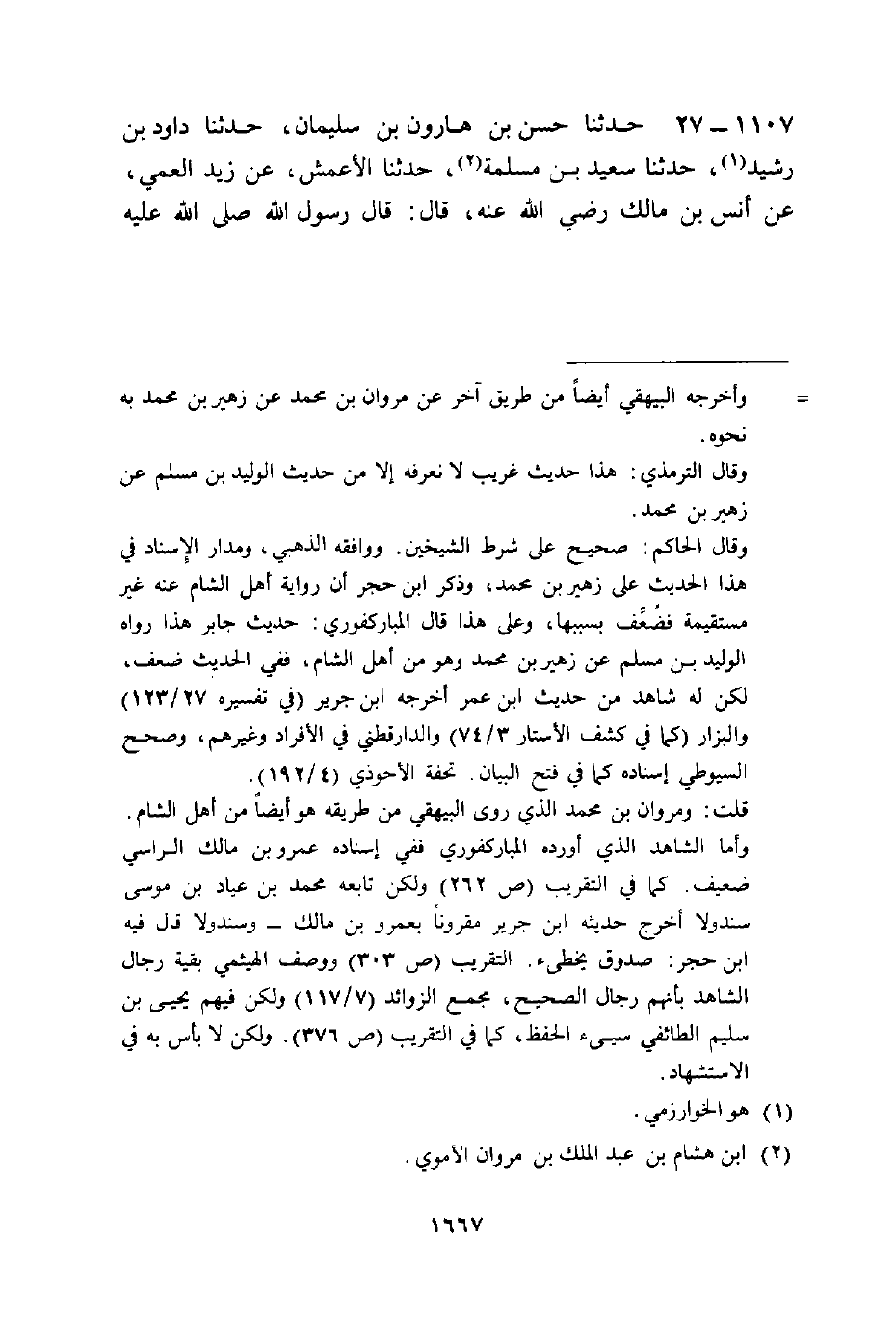 1107272727 - حَدَّثَنَا حَسَنُ بْنُ هَارُونَ بْنِ سُلَيْمَانَ، حَدَّثَنَا دَاوُدُ بْنُ رُشَيْدٍ، حَدَّثَنَا سَعِيدُ بْنُ مَسْلَمَةَ، حَدَّثَنَا الْأَعْمَشُ، عَنْ زَيْدٍ الْعَمِّيِّ، عَنْ أَنَسِ بْنِ مَالِكٍ رَضِيَ اللَّهُ عَنْهُ قَالَ: قَالَ رَسُولُ اللَّهِ صلّى الله عليه -[1668]- وسلم: §" سَتْرٌ بَيْنَ أَعْيُنِ الْجِنِّ وَعَوْرَاتِ بَنِي آدَمَ إِذَا وَضَعَ ثَوْبَهُ قَالَ: بِسْمِ اللَّهِ " حَدَّثَنَا جَعْفَرُ بْنُ أَحْمَدَ بْنِ فَارِسٍ، حَدَّثَنَا أَحْمَدُ بْنُ مَنِيعٍ، حَدَّثَنَا يَزِيدُ بْنُ هَارُونَ، أَخْبَرَنَا مُحَمَّدُ بْنُ الْفَضْلِ بْنِ عَطِيَّةَ، عَنْ زَيْدٍ الْعَمِّيِّ، عَنْ جَعْفَرٍ الْعَبْدِيِّ، عَنْ أَبِي سَعِيدٍ رَضِيَ اللَّهُ عَنْهُ، عَنِ النَّبِيِّ صَلَّى اللهُ عَلَيْهِ وَسَلَّمَ مِثْلَهُ