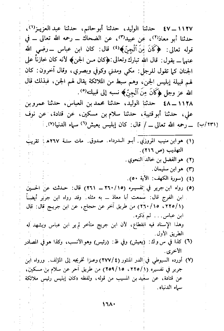 حَدَّثَنَا الْوَلِيدُ، حَدَّثَنَا أَبُو حَاتِمٍ، حَدَّثَنَا عَبْدُ الْعَزِيزِ، حَدَّثَنَا أَبُو مُعَاذٍ، عَنْ عُبَيْدٍ، عَنِ الضَّحَّاكِ رَحِمَهُ اللَّهُ تَعَالَى فِي قَوْلِهِ تَعَالَى {كَانَ مِنَ الْجِنِّ} [الكهف: 50] قَالَ: كَانَ ابْنُ عَبَّاسٍ رَضِيَ اللَّهُ عَنْهُمَا يَقُولُ: قَالَ اللَّهُ تَبَارَكَ وَتَعَالَى {§كَانَ مِنَ الْجِنِّ} [الكهف: 50] لِأَنَّهُ كَانَ خَازِنًا عَلَى الْجِنَّانِ، كَمَا تَقُولُ لِلرَّجُلِ: مَكِّيٌّ وَمَدَنِيٌّ وَكُوفِيٌّ وَبَصَرِيٌّ، وَقَالَ آخَرُونَ: كَانَ لَهُمْ قَبِيلَةُ إِبْلِيسِ الْجِنِّ وَهُمْ سِبْطٌ مِنَ الْمَلَائِكَةِ يُقَالُ لَهُمُ الْجِنُّ فَبِذَلِكَ قَالَ اللَّهُ عَزَّ وَجَلَّ {كَانَ مِنَ الْجِنِّ} [الكهف: 50] نَسَبَهُ إِلَى قَبِيلَتِهِ "