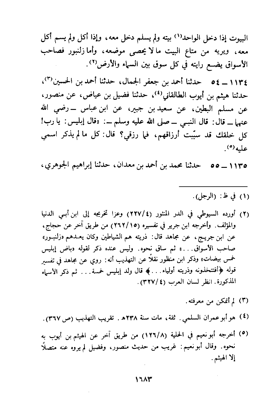 حَدَّثَنَا أَحْمَدُ بْنُ جَعْفَرٍ الْجَمَّالُ، حَدَّثَنَا أَحْمَدُ بْنُ الْحُسَيْنِ، حَدَّثَنَا هَيْثَمُ بْنُ أَيُّوبَ الطَّالْقَانِيُّ، حَدَّثَنَا فُضَيْلُ بْنُ عِيَاضٍ، عَنْ مَنْصُورٍ، عَنْ مُسْلِمٍ الْبَطِينِ، عَنْ سَعِيدِ بْنِ جُبَيْرٍ، عَنِ ابْنِ عَبَّاسٍ رَضِيَ اللَّهُ عَنْهُمَا قَالَ: قَالَ النَّبِيُّ صَلَّى اللهُ عَلَيْهِ وَسَلَّمَ: " قَالَ إِبْلِيسُ: §يَا رَبِّ كُلُّ خَلْقِكِ قَدْ سَبَّبْتَ أَرْزَاقَهُمْ فَمَا رِزْقِي؟ قَالَ: كُلُّ مَا لَمْ يُذْكَرِ اسْمِي عَلَيْهِ "