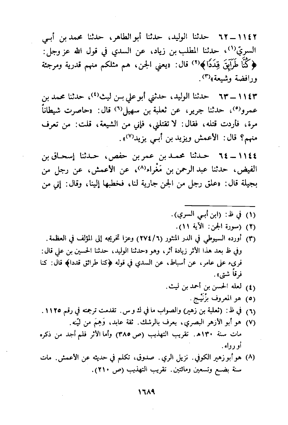 حَدَّثَنَا الْوَلِيدُ، حَدَّثَنَا أَبُو الطَّاهِرِ، حَدَّثَنَا مُحَمَّدُ بْنُ أَبِي السَّرِيِّ، حَدَّثَنَا الْمُطَّلِبُ بْنُ زِيَادٍ، عَنِ السُّدِّيِّ فِي قَوْلِ اللَّهِ عَزَّ وَجَلَّ {كُنَّا طَرَائِقَ قِدَدًا} [الجن: 11] قَالَ: «§يَعْنِي الْجِنَّ هُمْ مِثْلُكُمْ مِنْهُمْ قَدَرِيَّةٌ، وَمُرْجِئَةٌ، وَرَافِضَةٌ، وَشَيِعَةٌ»