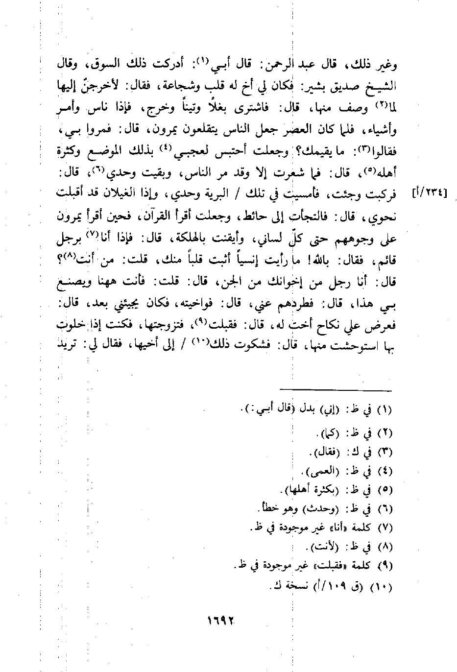 وَغَيْرِ ذَلِكَ قَالَ عَبْدُ الرَّحْمَنِ: قَالَ أَبِي: أَدْرَكْتُ ذَلِكَ السُّوقَ، وَقَالَ الشَّيْخُ صِدِّيقُ بَشِيرٍ: فَكَانَ لِي أَخٌ لَهُ قَلْبٌ وَشَجَاعَةٌ فَقَالَ: لَأَخْرُجَنَّ إِلَيْهَا لِمَا وُصِفَ مِنْهَا قَالَ: فَاشْتَرَى بَغْلًا وَتِينًا، وَخَرَجَ فَإِذَا نَاسٌ وَأَمْرٌ وَأَشْيَاءُ فَلَمَّا كَانَ الْعَصْرُ جَعَلَ النَّاسُ يَتَقَلَّعُونَ يَمُرُّونَ، قَالَ فَمَرُّوا بِي فَقَالُوا: مَا يُقِيمُكَ؟ وَجَعَلْتُ أَحْتَبِسُ لَعَجِبِي بِذَلِكَ الْمَوْضِعِ وَكَثْرَةِ أَهْلِهِ قَالَ: فَمَا شَعَرْتُ إِلَّا وَقَدْ مَرَّ النَّاسُ وَبَقِيَتُ وَحْدِي قَالَ: فَرَكِبْتُ وَجِئْتُ فَأَمْسَيْتُ فِي تِلْكَ الْبَرِيَّةِ وَحْدِي وَإِذَا الْغِيلَانُ، قَدْ أَقْبَلَتْ نَحْوِي قَالَ: فَالْتَجَأْتُ إِلَى حَائِطٍ وَجَعَلْتُ أَقْرَأُ الْقُرْآنَ فَحِينَ أَقْرَأُ يَمُرُّونَ عَلَى وُجُوهِهِمْ حَتَّى كَلَّ لِسَانِي وَأَيْقَنْتُ بِالْهَلَكَةِ قَالَ: فَإِذَا أَنَا بِرَجُلٍ قَائِمٍ فَقَالَ: بِاللَّهِ مَا رَأَيْتُ إِنْسِيًّا أَثْبَتَ قَلْبًا مِنْكَ قُلْتُ: مَنْ أَنْتَ؟ قَالَ: أَنَا رَجُلٌ مِنْ إِخْوَانِكَ مِنَ الْجِنِّ قَالَ: قُلْتُ: فَأَنْتَ هَاهُنَا وَيُصْنَعُ بِي هَذَا؟ قَالَ: فَطَرَدَهُمْ عَنِّي قَالَ: فَوَاخَيْتُهُ فَكَانَ يَجِيئُنِي بَعْدُ قَالَ: فَعَرَضَ عَلَيَّ نِكَاحَ أُخْتٍ لَهُ قَالَ: فَقَبِلْتُ فَتَزَوَّجْتُهَا فَكُنْتُ إِذَا خَلَوْتُ بِهَا اسْتَوْحَشْتُ مِنْهَا قَالَ: فَشَكَوْتُ ذَلِكَ إِلَى أَخِيهَا فَقَالَ لِي: تُرِيدُ