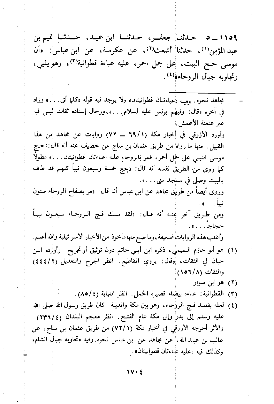 حَدَّثَنَا جَعْفَرٌ، حَدَّثَنَا ابْنُ حُمَيْدٍ، حَدَّثَنَا تَمِيمُ بْنُ عَبْدِ الْمُؤْمِنِ، حَدَّثَنَا أَشْعَثُ، عَنْ عِكْرِمَةَ، عَنِ ابْنِ عَبَّاسٍ، أَنَّ مُوسَى §حَجَّ الْبَيْتَ عَلَى جَمَلٍ أَحْمَرَ عَلَيْهِ عَبَاءَةٌ قَطَوَانِيَّةٌ وَهُوَ يُلَبِّي وَتُجَاوِبُهُ جِبَالُ الرَّوْحَاءِ "