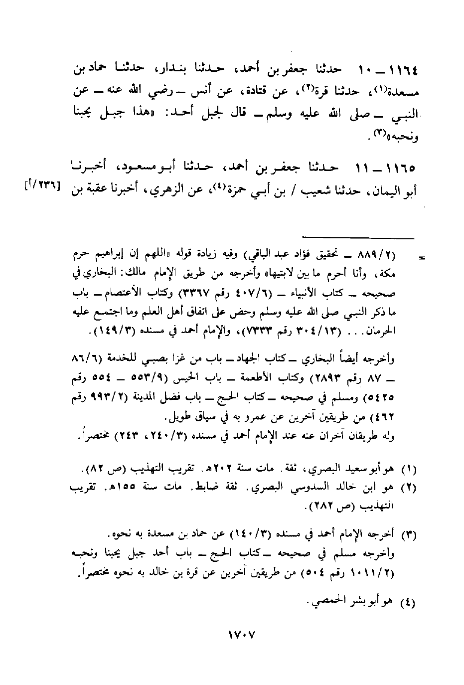حَدَّثَنَا جَعْفَرُ بْنُ أَحْمَدَ، حَدَّثَنَا بُنْدَارٌ، حَدَّثَنَا حَمَّادُ بْنُ مَسْعَدَةَ، حَدَّثَنَا قُرَّةُ، عَنْ قَتَادَةَ، عَنْ أَنَسٍ رَضِيَ اللَّهُ عَنْهُ عَنِ النَّبِيِّ صَلَّى اللهُ عَلَيْهِ وَسَلَّمَ قَالَ لِجَبَلِ أُحُدٍ: §«هَذَا جَبَلٌ يُحِبُّنَا وَنُحِبُّهُ»