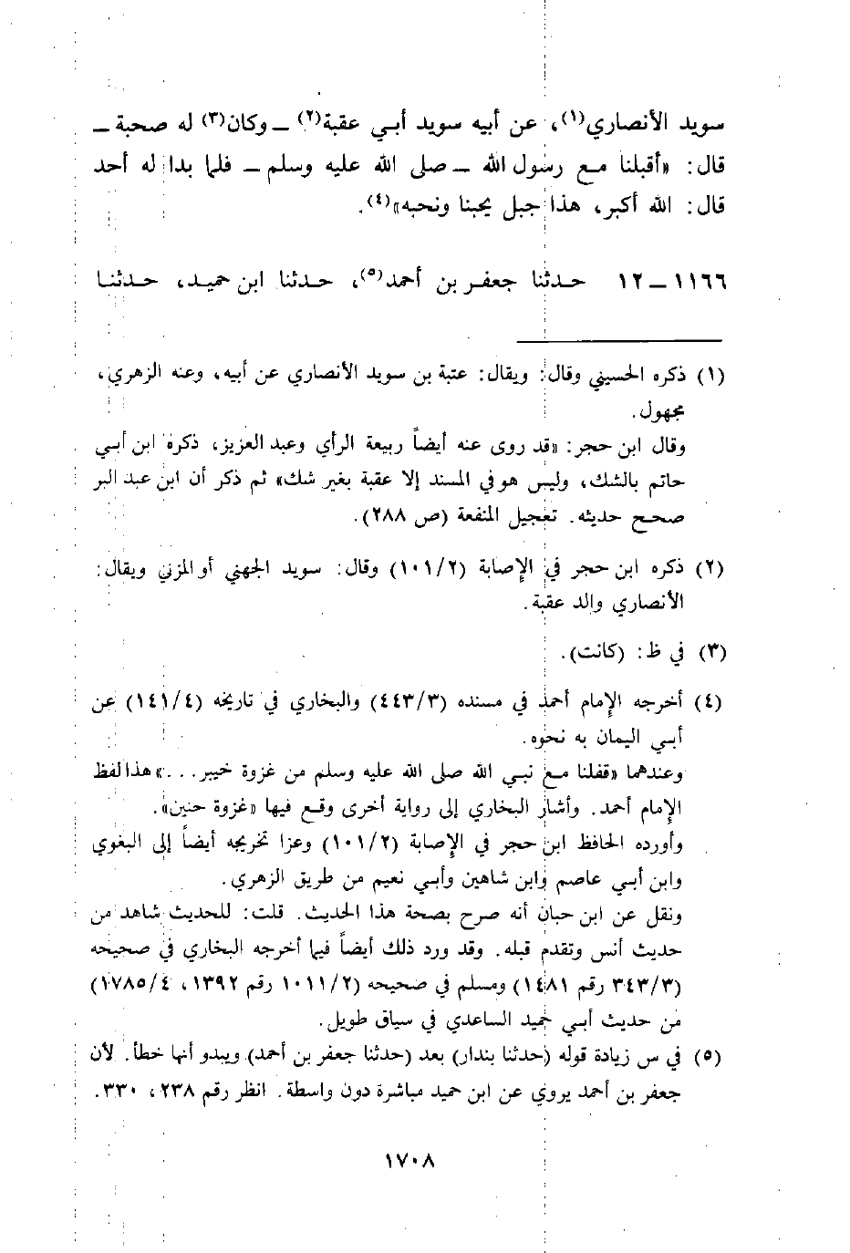 1166121212 - حَدَّثَنَا جَعْفَرُ بْنُ أَحْمَدَ، حَدَّثَنَا ابْنُ حُمَيْدٍ، حَدَّثَنَا -[1709]- إِبْرَاهِيمُ بْنُ الْمُخْتَارِ، عَنِ ابْنِ إِسْحَاقَ، عَنْ جَمِيلِ بْنِ عَبْدِ اللَّهِ، عَنْ أَنَسٍ رَضِيَ اللَّهُ عَنْهُ أَنَّ رَسُولَ اللَّهِ صَلَّى اللهُ عَلَيْهِ وَسَلَّمَ قَالَ: §«إِنَّ أُحُدًا جَبَلٌ يُحِبُّنَا وَنُحِبُّهُ»