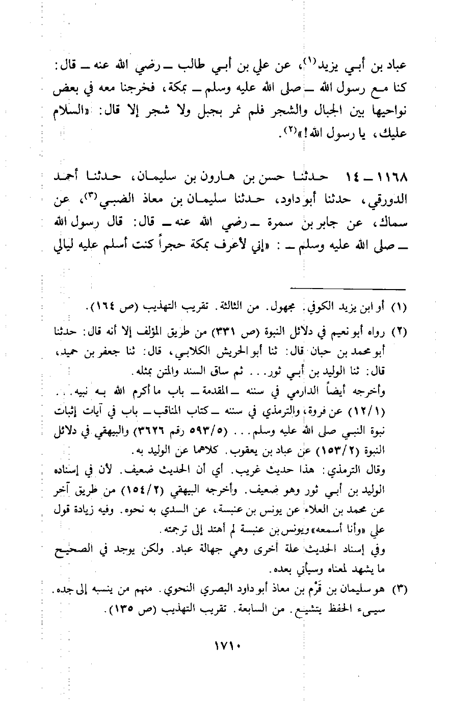 حَدَّثَنَا حَسَنُ بْنُ هَارُونَ بْنِ سُلَيْمَانَ، حَدَّثَنَا أَحْمَدُ الدَّوْرَقِيُّ، حَدَّثَنَا أَبُو دَاوُدَ، حَدَّثَنَا سُلَيْمَانُ بْنُ مُعَاذٍ الضَّبِّيُّ، عَنْ سِمَاكٍ، عَنْ جَابِرِ بْنِ سَمُرَةَ رَضِيَ اللَّهُ عَنْهُ قَالَ: قَالَ رَسُولُ اللَّهِ صَلَّى اللهُ عَلَيْهِ وَسَلَّمَ: §«إِنِّي لَأَعْرِفُ بِمَكَّةَ حَجَرًا كُنْتُ أُسَلِّمُ عَلَيْهِ لَيَالِيَ -[1711]- بُعِثْتُ فَيَرُدُّ عَلَيَّ السَّلَامَ إِنِّي لَأَعْرِفُهُ إِذَا مَرَرْتُ بِهِ»