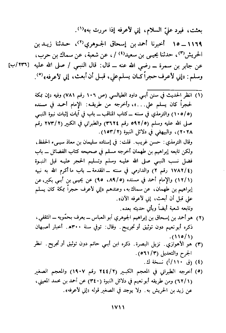 أَخْبَرَنَا أَحْمَدُ بْنُ إِسْحَاقَ الْجَوْهَرِيُّ، حَدَّثَنَا زَيْدُ بْنُ الْحُرَيْشِ، حَدَّثَنَا يَحْيَى بْنُ سَعِيدٍ، عَنْ شُعْبَةَ، عَنْ سِمَاكِ بْنِ حَرْبٍ، عَنْ جَابِرِ بْنِ سَمُرَةَ رَضِيَ اللَّهُ عَنْهُ قَالَ: قَالَ النَّبِيُّ صَلَّى اللهُ عَلَيْهِ وَسَلَّمَ: §«إِنِّي لَأَعْرِفُ حَجَرًا كَانَ يُسَلِّمُ عَلَيَّ قَبْلَ أَنْ أُبْعَثَ إِنِّي لَأَعْرِفُهُ» -[1712]- حَدَّثَنَا جَعْفَرُ بْنُ عَبْدِ اللَّهِ بْنِ الصَّبَّاحِ، حَدَّثَنَا إِسْمَاعِيلُ بْنُ مُوسَى، حَدَّثَنَا شَرِيكٌ، عَنْ سِمَاكٍ، عَنْ جَابِرِ بْنِ سَمُرَةَ رَضِيَ اللَّهُ عَنْهُ، عَنْ رَسُولِ اللَّهِ صَلَّى اللهُ عَلَيْهِ وَسَلَّمَ مِثْلَهُ
