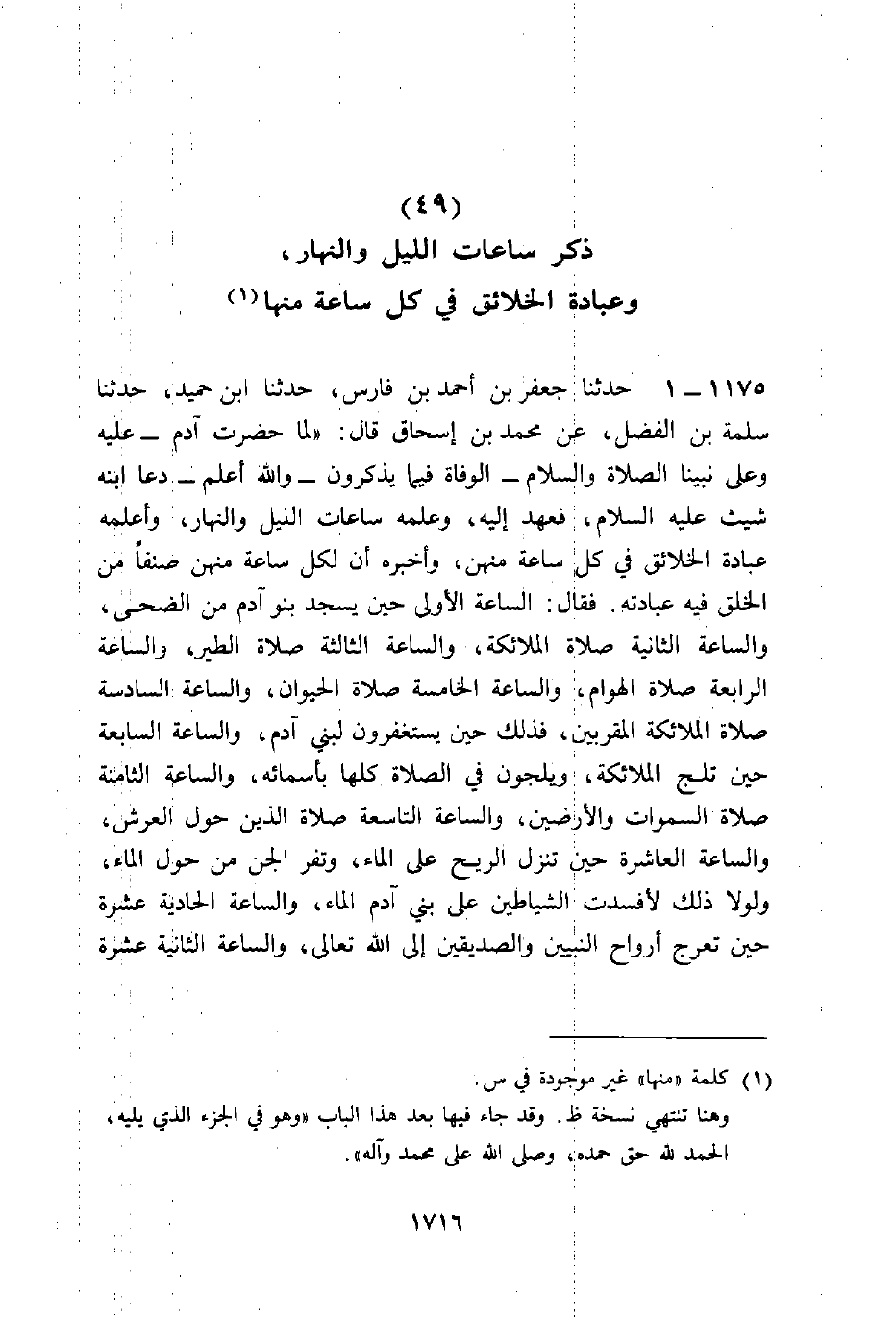 حَدَّثَنَا جَعْفَرُ بْنُ أَحْمَدَ بْنِ فَارِسٍ، حَدَّثَنَا ابْنُ حُمَيْدٍ، حَدَّثَنَا سَلَمَةُ بْنُ الْفَضْلِ، عَنْ مُحَمَّدِ بْنِ إِسْحَاقَ قَالَ: §" لَمَّا حَضَرَتْ آدَمَ عَلَيْهِ وَعَلَى نَبِيِّنَا الصَّلَاةُ وَالسَّلَامُ الْوَفَاةُ فِيمَا يَذْكُرُونَ وَاللَّهُ أَعْلَمُ دَعَا ابْنَهُ شِيثَ عَلَيْهِ السَّلَامُ فَعَهِدَ إِلَيْهِ وَعَلَّمَهُ سَاعَاتِ اللَّيْلِ وَالنَّهَارِ وَأَعْلَمَهُ عِبَادَةَ الْخَلَائِقِ فِي كُلِّ سَاعَةٍ مِنْهُنَّ، وَأَخْبَرَهُ أَنَّ لِكُلِّ سَاعَةٍ مِنْهُنَّ صِنْفًا مِنَ الْخَلْقِ فِيهِ عِبَادَتُهُ، فَقَالَ: السَّاعَةُ الْأولَى حِينَ يَسْجُدُ بَنُو آدَمَ مِنَ الضُّحَى، وَالسَّاعَةُ الثَّانِيَةُ صَلَاةُ الْمَلَائِكَةِ، وَالسَّاعَةُ الثَّالِثَةُ صَلَاةُ الطَّيْرِ، وَالسَّاعَةُ الرَّابِعَةُ صَلَاةُ الْهَوَامِّ، وَالسَّاعَةُ الْخَامِسَةُ صَلَاةُ الْحَيَوَانِ، وَالسَّاعَةُ السَّادِسَةُ صَلَاةُ الْمَلَائِكَةِ الْمُقَرَّبِينَ فَذَلِكَ حِينَ يَسْتَغْفِرُونَ لِبَنِي آدَمَ، وَالسَّاعَةُ السَّابِعَةُ حِينَ تَلِجُ الْمَلَائِكَةُ وَيَلِجُونَ فِي الصَّلَاةِ كُلِّهَا بِأَسْمَائِهِ وَالسَّاعَةُ الثَّامِنَةُ صَلَاةُ السَّمَاوَاتِ وَالْأَرْضِينَ، وَالسَّاعَةُ التَّاسِعَةُ صَلَاةُ الَّذِينَ حَوْلَ الْعَرْشِ، وَالسَّاعَةُ الْعَاشِرَةُ حِينَ تَنْزِلُ الرِّيحُ عَلَى الْمَاءِ وَتَفِرُّ الْجِنُّ مِنْ حَوْلِ الْمَاءِ وَلَوْلَا ذَلِكَ لَأَفْسَدَتِ الشَّيَاطِينُ عَلَى بَنِي آدَمَ الْمَاءَ، وَالسَّاعَةُ الْحَادِيَةَ عَشْرَةَ حِينَ تَعْرُجُ أَرْوَاحُ النَّبِيِّينَ وَالصِّدِّيقِينَ إِلَى اللَّهِ تَعَالَى، وَالسَّاعَةُ الثَّانِيَةَ عَشْرَةَ