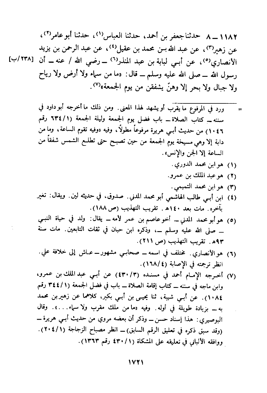 حَدَّثَنَا جَعْفَرُ بْنُ أَحْمَدَ، حَدَّثَنَا الْعَبَّاسُ، حَدَّثَنَا أَبُو عَامِرٍ، عَنْ زُهَيْرٍ، عَنْ عَبْدِ اللَّهِ بْنِ مُحَمَّدِ بْنِ عَقِيلٍ، عَنْ عَبْدِ الرَّحْمَنِ بْنِ يَزِيدَ الْأَنْصَارِيِّ، عَنْ أَبِي لُبَابَةَ بْنِ عَبْدِ الْمُنْذِرِ رَضِيَ اللَّهُ عَنْهُ أَنَّ رَسُولَ اللَّهِ صَلَّى اللهُ عَلَيْهِ وَسَلَّمَ قَالَ: §«مَا مِنْ سَمَاءٍ وَلَا أَرْضٍ وَلَا رِيَاحٍ وَلَا جِبَالٍ وَلَا بَحْرٍ إِلَّا وَهُنَّ يُشْفِقْنَ مِنْ يَوْمِ الْجُمُعَةِ»