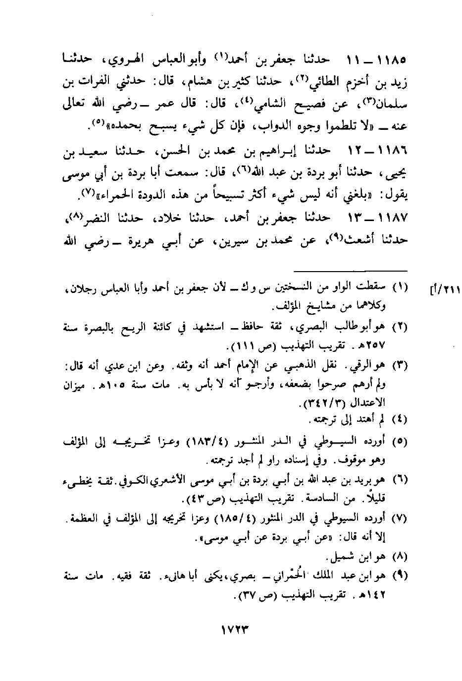 1187131313 - حَدَّثَنَا جَعْفَرُ بْنُ أَحْمَدَ، حَدَّثَنَا خَلَّادٌ، حَدَّثَنَا النَّضْرُ، حَدَّثَنَا أَشْعَثُ، عَنْ مُحَمَّدِ بْنِ سِيرِينَ، عَنْ أَبِي هُرَيْرَةَ رَضِيَ اللَّهُ -[1724]- عَنْهُ عَنِ النَّبِيِّ صَلَّى اللهُ عَلَيْهِ وَسَلَّمَ " §أَنَّ نَبِيًّا مِنَ الْأَنْبِيَاءِ قَالَ تَحْتَ شَجَرَةٍ فَلَدَغَتْهُ نَمْلَةٌ فَأَمَرَ أَنْ يُحْرَقَ فَأَوْحَى اللَّهُ تَعَالَى إِلَيْهِ: «هَلَّا نَمْلَةٌ وَاحِدَةٌ فَإِنَّهُنَّ يُسَبِّحْنَ»
