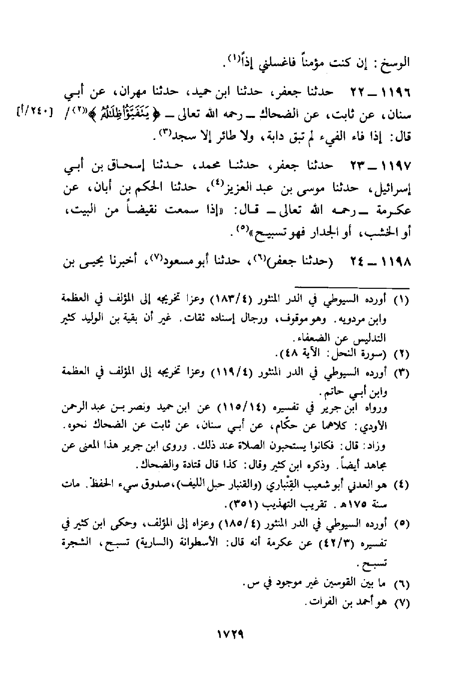 حَدَّثَنَا جَعْفَرٌ، حَدَّثَنَا ابْنُ حُمَيْدٍ، حَدَّثَنَا مِهْرَانُ، عَنْ أَبِي سِنَانٍ، عَنْ ثَابِتٍ، عَنِ الضَّحَّاكِ رَحِمَهُ اللَّهُ تَعَالَى {§يَتَفَيَّأُ ظِلَالُهُ} [النحل: 48] قَالَ: إِذَا فَاءَ الْفَيْءُ لَمْ تَبْقَ دَابَّةٌ وَلَا طَائِرٌ إِلَّا سَجَدَ