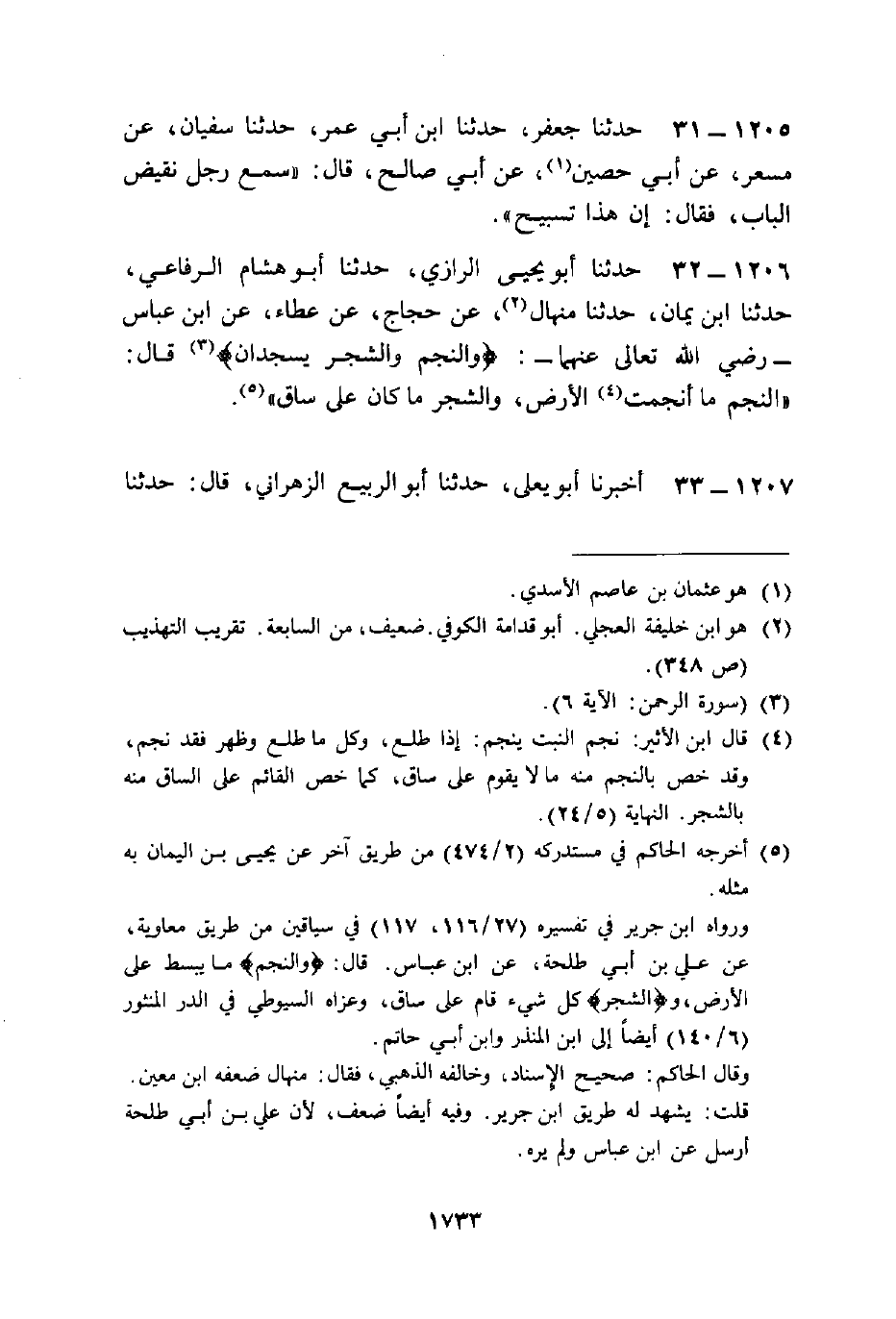 حَدَّثَنَا أَبُو يَحْيَى الرَّازِيُّ، حَدَّثَنَا أَبُو هَاشِمٍ الرِّفَاعِيُّ، حَدَّثَنَا ابْنُ يَمَانٍ، حَدَّثَنَا مِنْهَالٌ، عَنْ حَجَّاجٍ، عَنْ عَطَاءٍ، عَنِ ابْنِ عَبَّاسٍ رَضِيَ اللَّهُ تَعَالَى عَنْهُمَا: {§وَالنَّجْمُ وَالشَّجَرُ يَسْجُدَانِ} [الرحمن: 6] قَالَ: النَّجْمُ مَا أَنْجَمَتِ الْأَرْضُ وَالشَّجَرُ مَا كَانَ عَلَى سَاقٍ "