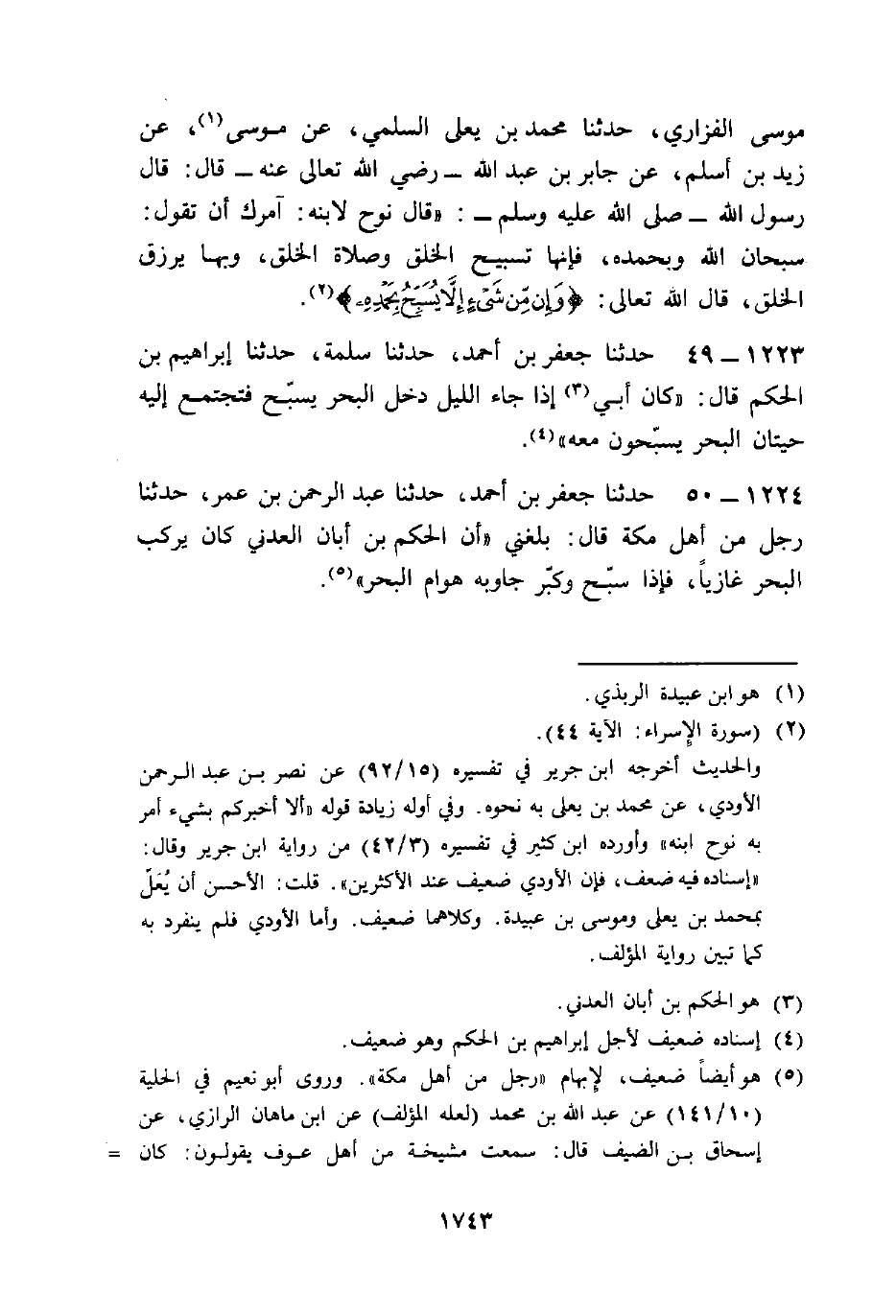 1223494949 - حَدَّثَنَا جَعْفَرُ بْنُ أَحْمَدَ، حَدَّثَنَا سَلَمَةُ، حَدَّثَنَا إِبْرَاهِيمُ بْنُ الْحَكَمِ قَالَ: §«كَانَ أَبِي إِذَا جَاءَ اللَّيْلُ دَخَلَ الْبَحْرَ يُسَبِّحُ فَتَجْتَمِعُ إِلَيْهِ حِيتَانُ الْبَحْرِ يُسَبِّحُونَ مَعَهُ»