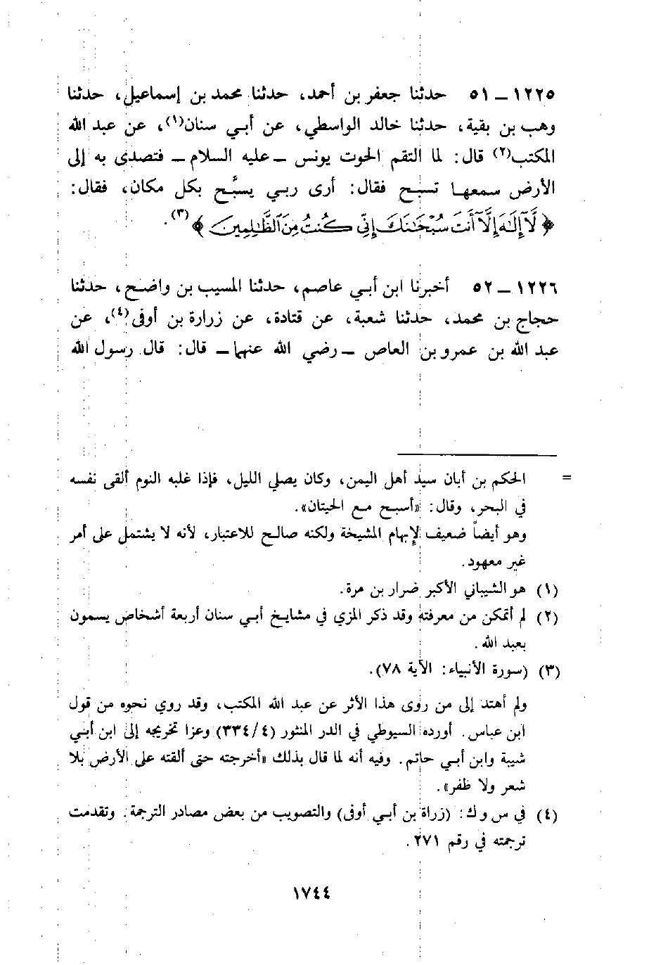 حَدَّثَنَا جَعْفَرُ بْنُ أَحْمَدَ، حَدَّثَنَا مُحَمَّدُ بْنُ إِسْمَاعِيلَ، حَدَّثَنَا وَهْبُ بْنُ بَقِيَّةَ، حَدَّثَنَا خَالِدٌ الْوَاسِطِيُّ، عَنْ أَبِي سِنَانٍ، عَنْ عَبْدِ اللَّهِ الْمُكْتِبِ قَالَ: لَمَّا الْتَقَمَ الْحُوتُ يُونُسَ عَلَيْهِ السَّلَامُ فَتَصَدَّى بِهِ إِلَى الْأَرْضِ سَمِعَهَا تُسَبِّحُ فَقَالَ: §أَرَى رَبِّي يُسَبَّحُ بِكُلِّ مَكَانٍ فَقَالَ: {لَا إِلَهَ إِلَّا أَنْتَ سُبْحَانَكَ إِنِّي كُنْتُ مِنَ الظَّالِمِينَ} [الأنبياء: 87]