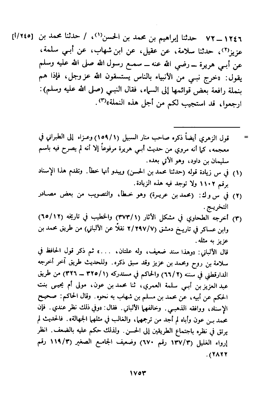 حَدَّثَنَا إِبْرَاهِيمُ بْنُ مُحَمَّدِ بْنِ الْحَسَنِ، حَدَّثَنَا مُحَمَّدُ بْنُ عُزَيْزٍ، حَدَّثَنَا سَلَامَةُ، عَنْ عُقَيْلٍ، عَنِ ابْنِ شِهَابٍ، عَنْ أَبِي سَلَمَةَ، عَنْ أَبِي هُرَيْرَةَ رَضِيَ اللَّهُ عَنْهُ سَمِعَ رَسُولُ اللَّهِ صَلَّى اللهُ عَلَيْهِ وَسَلَّمَ يَقُولُ: §" خَرَجَ نَبِيٌّ مِنَ الْأَنْبِيَاءِ بِالنَّاسِ يَسْتَسْقُونَ اللَّهَ عَزَّ وَجَلَّ فَإِذَا هُمْ بَنْمِلَةٍ رَافِعَةٍ بَعْضَ قَوَامِهَا إِلَى السَّمَاءِ فَقَالَ النَّبِيُّ صَلَّى اللهُ عَلَيْهِ وَسَلَّمَ: ارْجِعُوا قَدِ اسْتُجِيبَ لَكُمْ مِنْ أَجْلِ هَذِهِ النَّمْلَةِ "