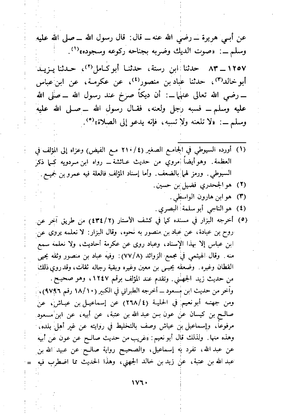 حَدَّثَنَا ابْنُ رُسْتَةَ، حَدَّثَنَا أَبُو كَامِلٍ، حَدَّثَنَا يَزِيدُ أَبُو خَالِدٍ، حَدَّثَنَا عَبَّادُ بْنُ مَنْصُورٍ، عَنْ عِكْرِمَةَ، عَنِ ابْنِ عَبَّاسٍ رَضِيَ اللَّهُ تَعَالَى عَنْهُمَا، أَنَ دِيكًا صَرَخَ عِنْدَ رَسُولِ اللَّهِ صَلَّى اللهُ عَلَيْهِ وَسَلَّمَ فَسَبَّهُ رَجُلٌ وَلَعَنَهُ فَقَالَ رَسُولُ اللَّهِ صَلَّى اللهُ عَلَيْهِ وَسَلَّمَ: §«لَا تَلْعَنْهُ وَلَا تَسُبَّهُ فَإِنَّهُ يَدْعُو إِلَى الصَّلَاةِ»