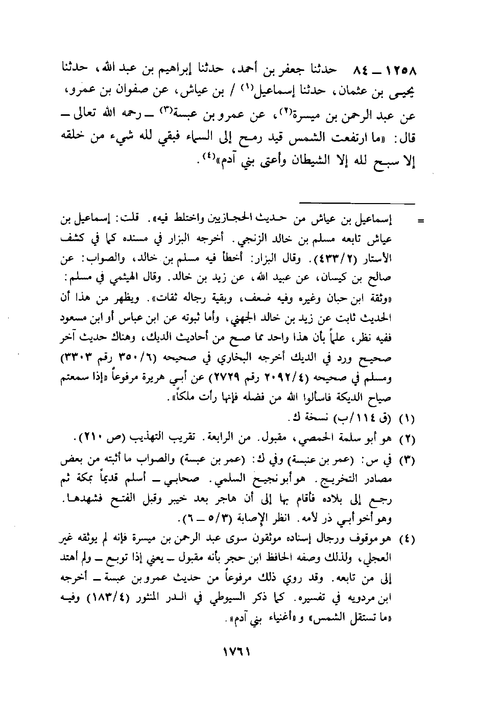 حَدَّثَنَا جَعْفَرُ بْنُ أَحْمَدَ، حَدَّثَنَا إِبْرَاهِيمُ بْنُ عَبْدِ اللَّهِ، حَدَّثَنَا يَحْيَى بْنُ عُثْمَانَ، حَدَّثَنَا إِسْمَاعِيلُ بْنُ عَيَّاشٍ، عَنْ صَفْوَانَ بْنِ عَمْرٍو، عَنْ عَبْدِ الرَّحْمَنِ بْنِ مَيْسَرَةَ، عَنْ عَمْرِو بْنِ عَبَسَةَ رَحِمَهُ اللَّهُ تَعَالَى قَالَ: «§مَا ارْتَفَعَتِ الشَّمْسُ قَيْدَ رُمْحٍ إِلَى السَّمَاءِ فَبَقِيَ لِلَّهِ شَيْءٌ مِنْ خَلْقِهِ إِلَّا سَبَّحَ لِلَّهِ إِلَّا الشَّيْطَانُ وَأَعْتَى بَنِي آدَمَ»