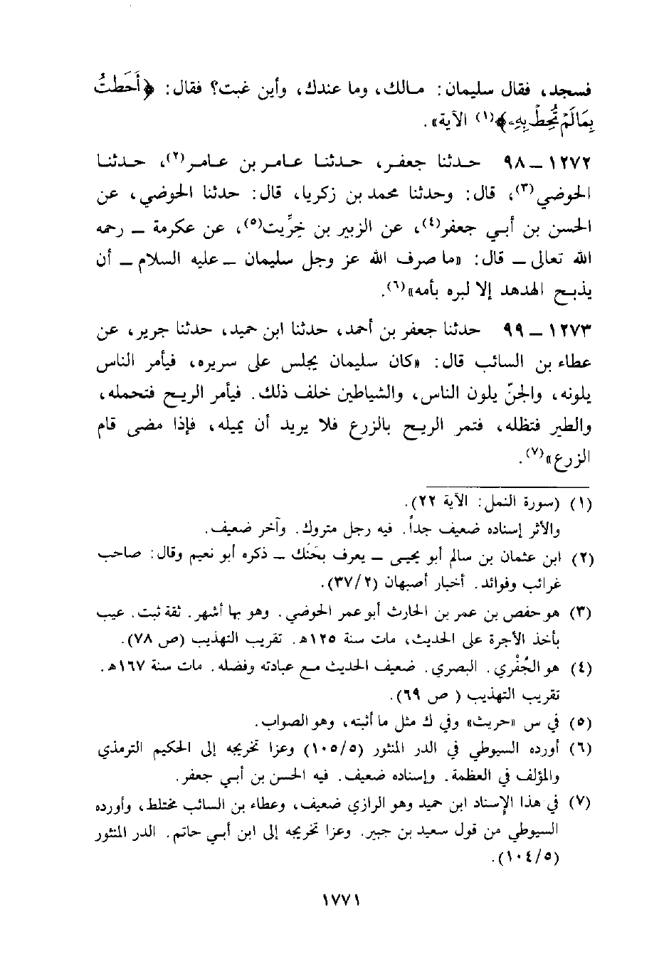 حَدَّثَنَا جَعْفَرُ بْنُ أَحْمَدَ، حَدَّثَنَا ابْنُ حُمَيْدٍ، حَدَّثَنَا جَرِيرٌ، عَنْ عَطَاءِ بْنِ السَّائِبِ قَالَ: «§كَانَ سُلَيْمَانُ يَجْلِسُ عَلَى سَرِيرِهِ فَيَأْمُرُ النَّاسَ يَلُونَهُ، وَالْجِنُّ يَلُونَ النَّاسَ، وَالشَّيَاطِينُ خَلْفَ ذَلِكَ، فَيَأْمُرُ الرِّيحَ فَتَحْمِلُهُ، وَالطَّيْرَ فَتُظِلُّهُ، فَتَمُرُّ الرِّيحُ بِالزَّرْعِ، فَلَا يُرِيدُ أَنْ يُمِيلَهُ، فَإِذَا مَضَى قَامَ الزَّرْعُ»