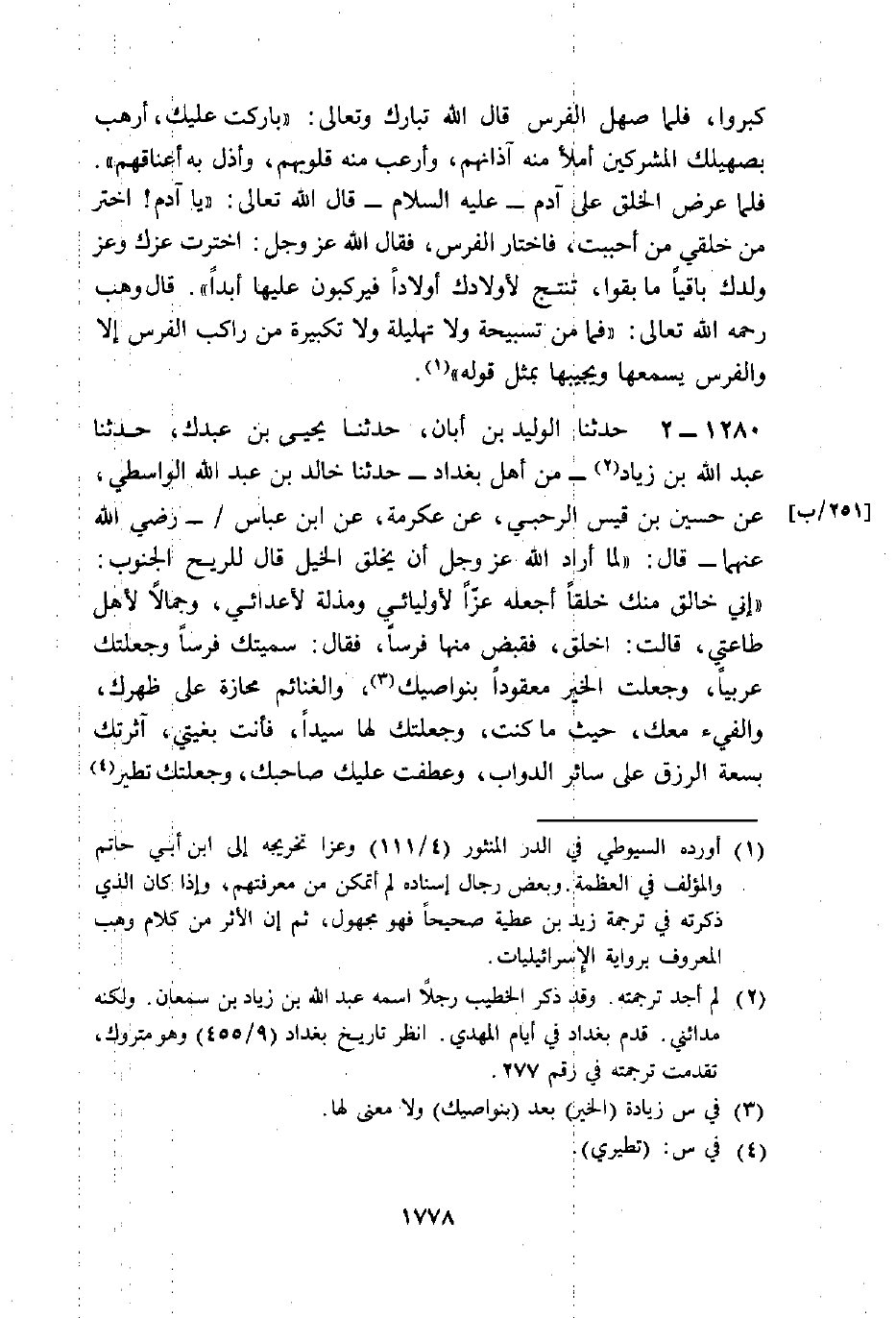 كَبَّرُوا» ، فَلَمَّا صَهَلَ الْفَرَسُ قَالَ اللَّهُ تَبَارَكَ وَتَعَالَى: «بَارَكْتُ عَلَيْكَ، أَرْهِبُ بِصَهِيلِكَ الْمُشْرِكِينَ أَمْلَأُ مِنْهُ آذَانَهُمْ، وَأُرْعِبُ مِنْهُ قُلُوبَهُمْ، وَأُذِلُّ بِهِ أَعْنَاقَهُمْ» . فَلَمَّا عُرِضَ الْخَلْقُ عَلَى آدَمَ عَلَيْهِ السَّلَامُ قَالَ اللَّهُ تَعَالَى: " يَا آدَمُ اخْتَرْ مِنْ خَلْقِي مَنْ أَحْبَبْتَ، فَاخْتَارَ الْفَرَسَ فَقَالَ اللَّهُ عَزَّ وَجَلَّ: «اخْتَرْتَ عِزَّكَ وَعِزَّ وَلَدِكَ بَاقِيًا مَا بَقَوْا، تُنْتِجُ لِأَوْلَادِكَ أَوْلَادًا فَيَرْكَبُونَ عَلَيْهَا أَبَدًا» . قَالَ وَهْبٌ رَحِمَهُ اللَّهُ تَعَالَى: فَمَا مِنْ تَسْبِيحَةٍ وَلَا تَهْلِيلَةٍ وَلَا تَكْبِيرَةٍ مِنْ رَاكِبٍ الْفَرَسَ إِلَّا وَالْفَرَسُ يَسْمَعُهَا وَيُجِيبُهَا بِمِثْلِ قَوْلِهِ "