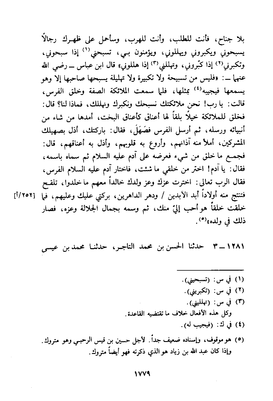 بِلَا جَنَاحٍ فَأَنْتَ للطَّلَبِ وَأَنْتَ لِلْهَرَبِ، وَسَأَحْمِلُ عَلَى ظَهْرِكَ رِجَالًا يُسَبِّحُونِي وَيُكَبِّرُونِي وَيُهَلِّلُونِي وَيُؤْمِنُونَ بِي، تُسَبِّحُنِي إِذَا سَبَّحُونِي، وَتُكَبِّرُنِي إِذَا كَبَّرُونِي، وَتُهَلِّلُنِي إِذَا هَلَّلُونِي، قَالَ ابْنُ عَبَّاسٍ رَضِيَ اللَّهُ عَنْهُمَا: فَلَيْسَ مِنْ تَسْبِيحَةٍ وَلَا تَكْبِيرَةٍ وَلَا تَهْلِيلَةٍ يُسَبَّحُهَا صَاحِبُهَا إِلَّا وَهُوَ يَسْمَعُهَا فَيُجِيبُهُ بِمِثْلِهَا فَلَمَّا سَمِعَتِ الْمَلَائِكَةُ الصِّفَةَ، وَخُلِقَ الْفَرَسُ قَالَتْ: يَا رَبِّ نَحْنُ مَلِائِكَتُكَ نُسَبُّحُكَ وَنُكَّبِرُكَ وَنُهَلِّلُكَ فَمَاذَا لَنَا؟ قَالَ: فَخَلَقَ لِلْمَلَائِكَةِ خَيْلًا بُلْقًا لَهَا أَعْنَاقٌ كَأَعْنَاقِ الْبُخْتِ أَمَدَّهَا مَنْ شَاءَ مِنْ أَنْبِيَائِهِ وَرُسُلِهِ ثُمَّ أَرْسَلَ الْفَرَسَ فَصَهِلَ فَقَالَ: بَارَكْتُكَ أُذِلُّ بِصَهْيلِكِ الْمُشْرِكِينَ أَمْلَأُ مِنْهُ آذَانَهُمْ وَأُرَوِّعُ بِهِ قُلُوبَهُمْ وَأُذِلُّ بِهِ أَعْنَاقَهُمْ، قَالَ: فَجَمَعَ مَا خَلَقَ مِنْ شَيْءٍ فَعَرَضَهُ عَلَى آدَمَ عَلَيْهِ السَّلَامُ ثُمَّ سَمَّاهُ بِاسْمِهِ فَقَالَ: يَا آدَمُ اخْتَرْ مِنْ خَلْقِي مَا شِئْتَ فَاخْتَارَ آدَمُ عَلَيْهِ السَّلَامُ الْفَرَسَ فَقَالَ الرَّبُّ تَعَالَى: «اخْتَرْتَ عِزَّكَ وَعِزَّ وَلَدِكَ خَالِدًا مَعَهُمْ مَا خَلَدُوا تُلَقَّحُ فَتُنْتِجُ مِنْهُ أَوْلَادًا أَبَدَ الْآبِدِينَ وَدْهَرَ الدَّاهِرينَ بَرَكَتِي عَلَيْكَ وَعَلَيْهِمْ فَمَا خَلَقْتُ خَلْقًا هُوَ أَحَبُّ إِلَيَّ مِنْكَ، ثُمَّ وَسَمَهُ بِجَمالِ الْجَلَالَةِ وَعِزَّهُ، فَصَارَ ذَلِكَ فِي وَلَدِهِ»