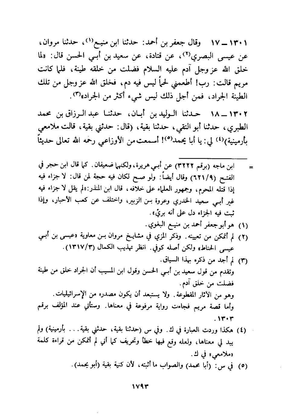 وَقَالَ جَعْفَرُ بْنُ أَحْمَدَ، حَدَّثَنَا ابْنُ مَنِيعٍ، حَدَّثَنَا مَرْوَانُ، عَنْ عِيسَى الْبَصْرِيِّ، عَنْ قَتَادَةَ، عَنْ سَعِيدِ بْنِ أَبِي الْحَسَنِ قَالَ: §" لَمَّا خَلَقَ اللَّهُ عَزَّ وَجَلَّ آدَمَ عَلَيْهِ السَّلَامُ فَضَلَتْ مِنْ خَلْقِهِ طِينَةٌ فَلَمَّا كَانَتْ مَرْيَمُ قَالَتْ: رَبِّ أَطْعِمْنِي لَحْمًا لَيْسَ فِيهِ دَمٌ فَخَلَقَ اللَّهُ عَزَّ وَجَلَّ مِنْ تِلْكَ الطِّينَةِ الْجَرَادَ فَمِنْ أَجْلِ ذَلِكَ لَيْسَ شَيْءٌ أَكْثَرَ مِنَ الْجَرَادِ "