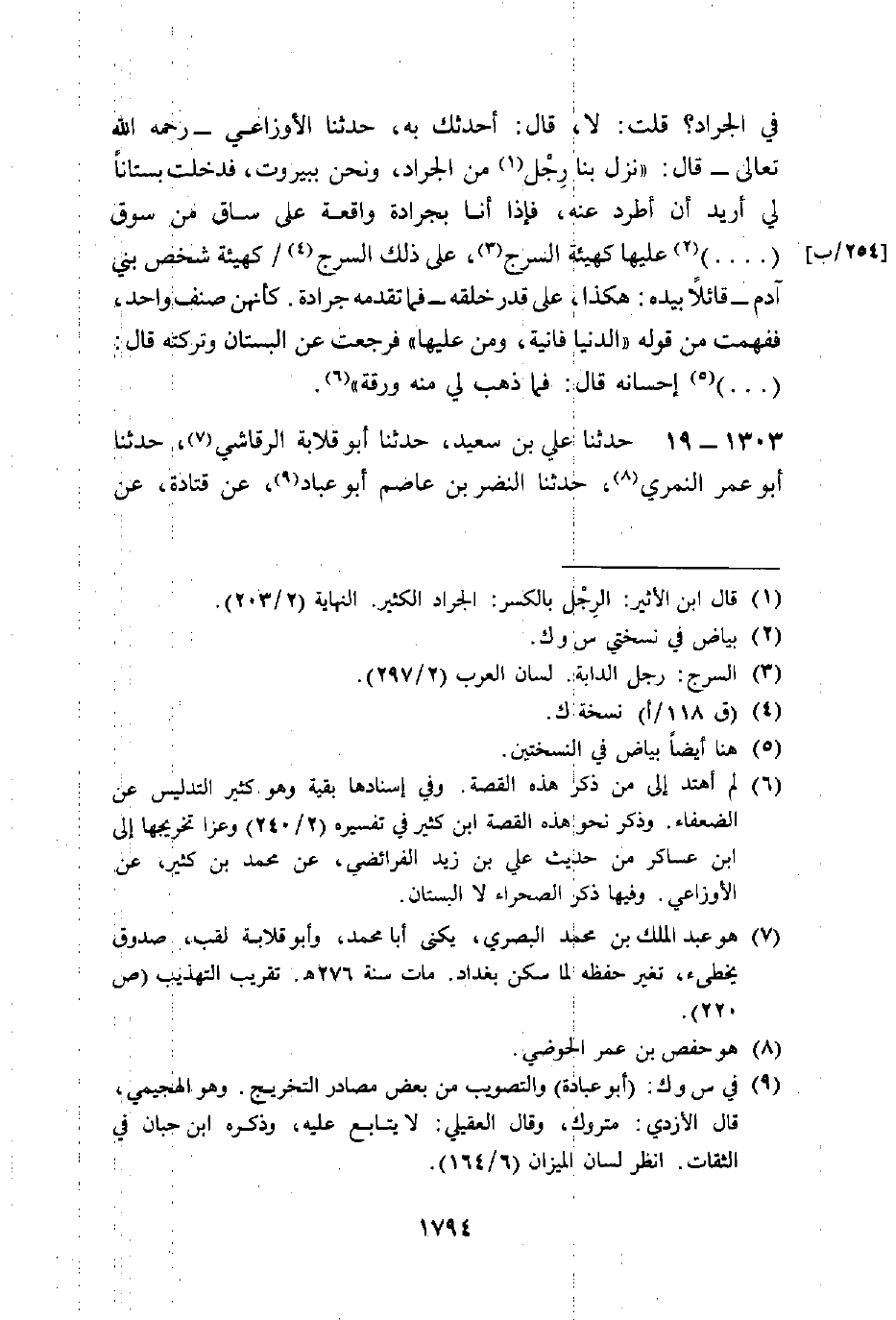 حَدَّثَنَا عَلِيُّ بْنُ سَعِيدٍ، حَدَّثَنَا أَبُو قِلَابَةَ الرَّقَاشِيُّ، حَدَّثَنَا أَبُو عُمَرَ النَّمَرِيُّ، حَدَّثَنَا النَّضْرُ بْنُ عَاصِمٍ أَبُو عَبَّادٍ، عَنْ قَتَادَةَ، عَنْ -[1795]- مُحَمَّدِ بْنِ سِيرِينَ، عَنْ أَبِي هُرَيْرَةَ رَضِيَ اللَّهُ تَعَالَى عَنْهُ قَالَ: سُئِلَ رَسُولُ اللَّهِ صَلَّى اللهُ عَلَيْهِ وَسَلَّمَ عَنِ الْجَرَادِ فَقَالَ: §«إِنَّ مَرْيَمَ سَأَلَتْ رَبَّهَا تَبَارَكَ وَتَعَالَى أَنْ يُطْعِمَهَا لَحْمًا لَيْسَ فِيهِ دَمٌ فَأَطْعَمَهَا الْجَرَادَ»