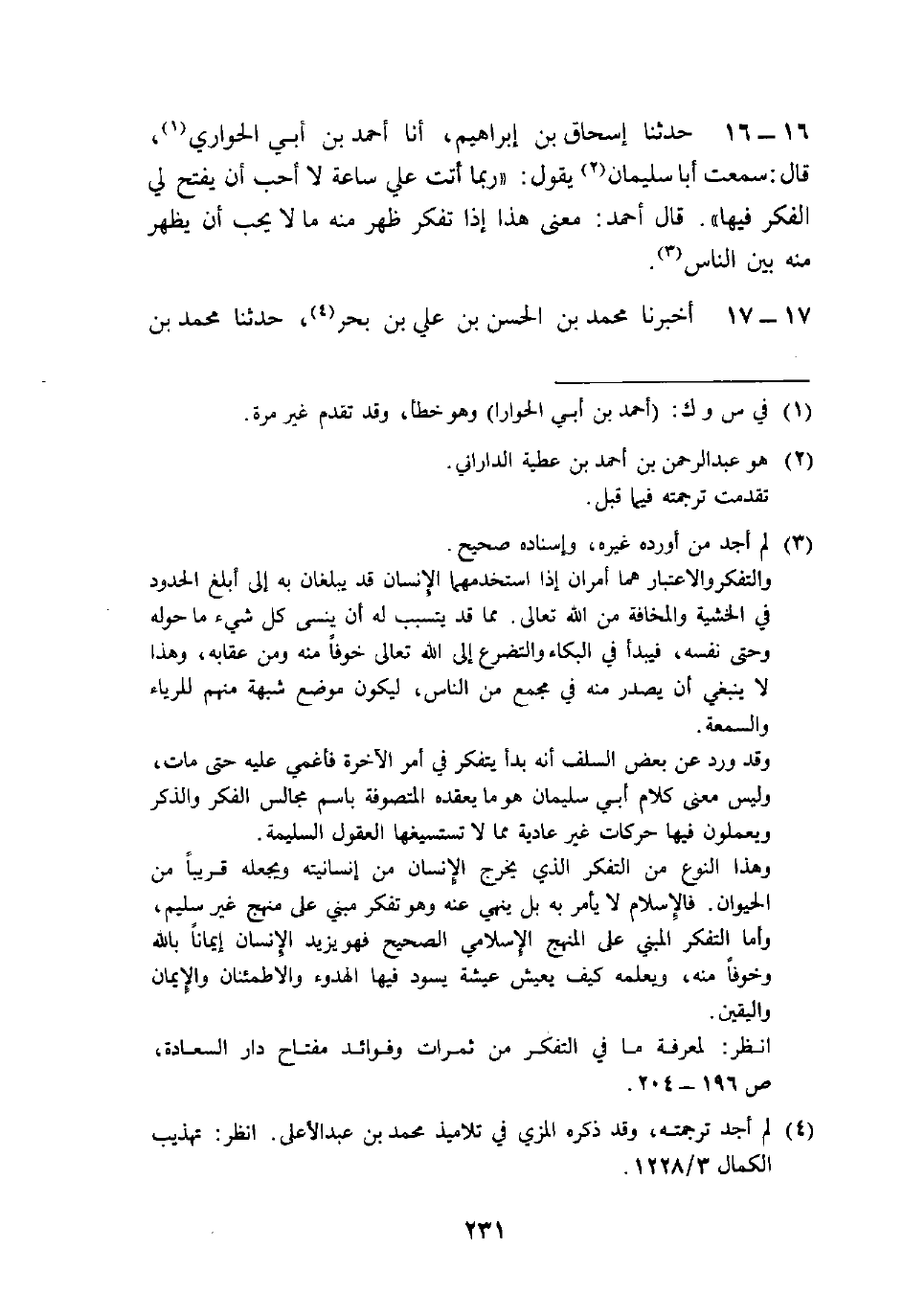 16 - حَدَّثَنَا إِسْحَاقُ بْنُ إِبْرَاهِيمَ، أَنَا أَحْمَدُ بْنُ أَبِي الْحَوَارِيِّ، قَالَ: سَمِعْتُ أَبَا سُلَيْمَانَ، يَقُولُ: §«رُبَّمَا أَتَتْ عَلَيَّ سَاعَةٌ لَا أُحِبُّ أَنْ يُفْتَحَ لِي الْفِكْرُ فِيهَا» ، قَالَ أَحْمَدُ: مَعْنَى هَذَا إِذَا تَفَكَّرَ ظَهَرَ مِنْهُ مَا لَا يُحِبُّ أَنْ يَظْهَرَ مِنْهُ بَيْنَ النَّاسِ