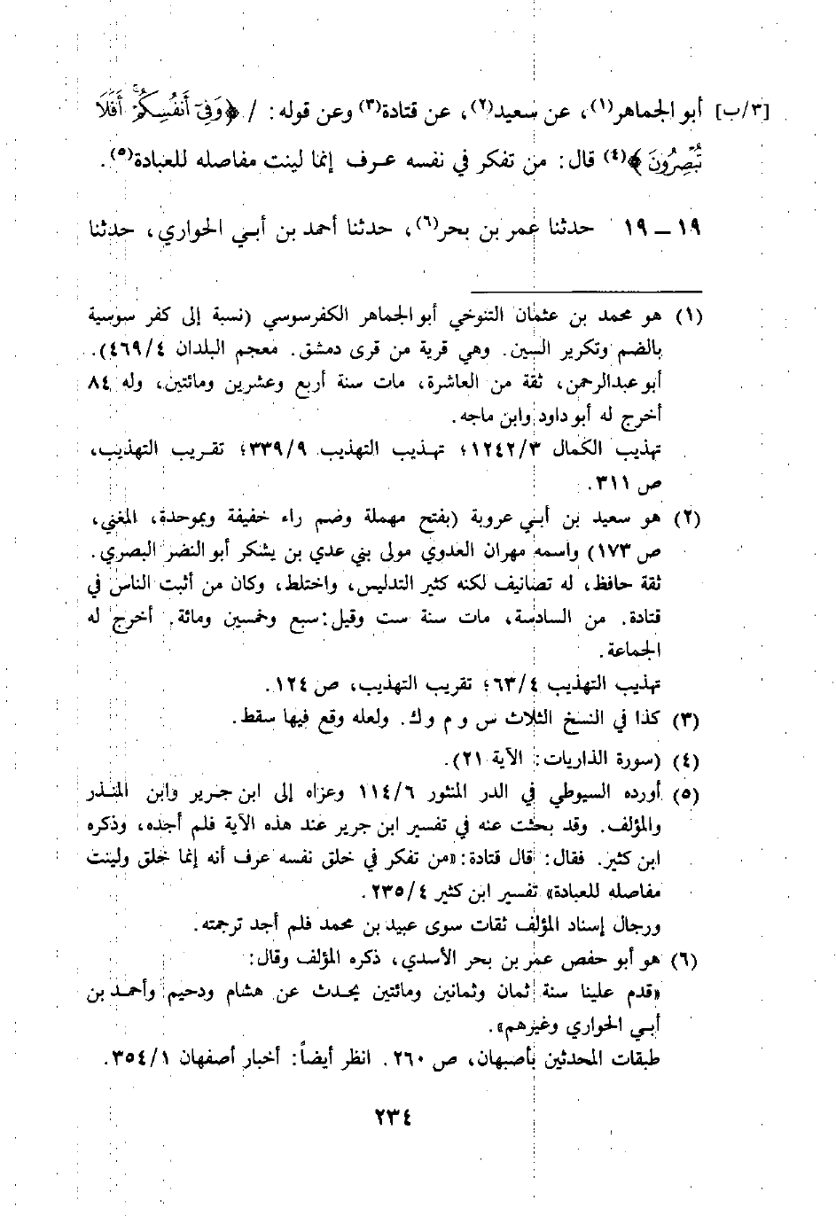 19 - حَدَّثَنَا عُمَرُ بْنُ بَحْرٍ، حَدَّثَنَا أَحْمَدُ بْنُ أَبِي الْحَوَارِيِّ، حَدَّثَنَا -[235]- الْقُرْقُسَانِيُّ، قَالَ: أَتَى يُوسُفُ بْنُ أَسْبَاطٍ بِبَاكُورِ تَمْرَةٍ، فَقَلَّبَهَا، ثُمَّ وَضَعَهَا بَيْنَ يَدَيْهِ، وَقَالَ: «§إِنَّ الدُّنْيَا لَمْ تُخْلَقْ لِتَنْظُرَ إِلَيْهَا، وَإِنَّمَا خُلِقَتْ لِتَنْظُرَ بِهَا إِلَى الْآخِرَةِ»