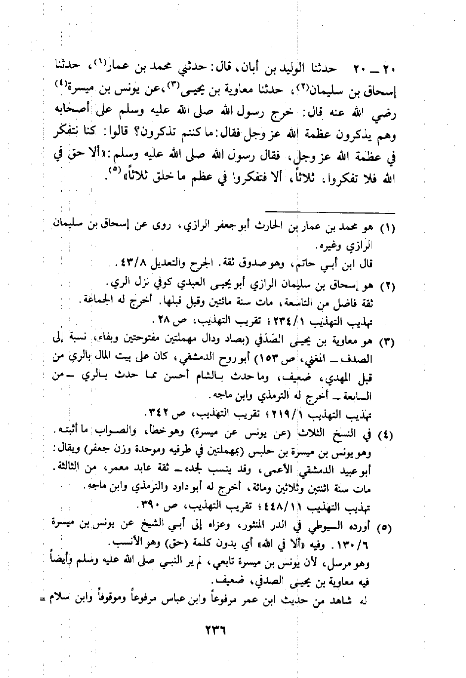 20 - حَدَّثَنَا الْوَلِيدُ بْنُ أَبَانَ، قَالَ: حَدَّثَنِي مُحَمَّدُ بْنُ عَمَّارٍ، حَدَّثَنَا إِسْحَاقُ بْنُ سُلَيْمَانَ، حَدَّثَنَا مُعَاوِيَةُ بْنُ يَحْيَى، عَنْ يُونُسَ بْنِ مَيْسَرَةَ رَضِيَ اللَّهُ عَنْهُ، قَالَ: خَرَجَ رَسُولُ اللَّهِ صَلَّى اللهُ عَلَيْهِ وَسَلَّمَ عَلَى أَصْحَابِهِ وَهُمْ يَذْكُرُونَ عَظَمَةَ اللَّهِ عَزَّ وَجَلَّ فَقَالَ: «§مَا كُنْتُمْ تَذْكُرُونَ؟» قَالُوا: كُنَّا نَتَفَكَّرُ فِي عَظَمَةِ اللَّهِ عَزَّ وَجَلَّ، فَقَالَ رَسُولُ اللَّهِ صَلَّى اللهُ عَلَيْهِ وَسَلَّمَ: «أَلَا حَقٌّ فِي اللَّهِ، فَلَا تَفَكَّرُوا» ثَلَاثًا «أَلَا فَتَفَكَّرُوا فِي عِظَمِ مَا خَلَقَ» ثَلَاثًا.