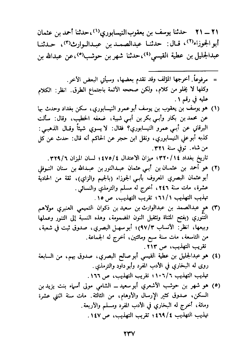 21 - حَدَّثَنَا يُوسُفُ بْنُ يَعْقُوبَ النَّيْسَابُورِيُّ، حَدَّثَنَا أَحْمَدُ بْنُ عُثْمَانَ أَبُو الْجَوْزَاءِ، قَالَ: حَدَّثَنَا عَبْدُ الصَّمَدِ بْنُ عَبْدِ الْوَارِثِ، حَدَّثَنَا عَبْدُ الْجَلِيلِ بْنُ عَطِيَّةَ الْقَيْسِيُّ، حَدَّثَنَا شَهْرُ بْنُ حَوْشَبٍ، عَنْ عَبْدِ اللَّهِ بْنِ -[238]- سَلَّامٍ رَضِيَ اللَّهُ عَنْهُ، قَالَ: خَرَجَ رَسُولُ اللَّهِ صَلَّى اللهُ عَلَيْهِ وَسَلَّمَ عَلَى نَاسٍ مِنْ أَصْحَابِهِ، وَهُمْ يَتَفَكَّرُونَ فِي خَلْقِ اللَّهِ عَزَّ وَجَلَّ، فَقَالَ صَلَّى اللهُ عَلَيْهِ وَسَلَّمَ: «فِيمَ تَتَفَكَّرُونَ؟» ، قَالُوا: نَتَفَكَّرُ فِي خَلْقِ اللَّهِ تَبَارَكَ وَتَعَالَى، قَالَ: «§فَلَا تَفَكَّرُوا فِي اللَّهِ، وَلَكِنْ تَفَكَّرُوا فِيمَا خَلَقَ اللَّهُ، فَإِنَّهُ خَلَقُ خَلْقًا قَدَمَاهُ فِي الْأَرْضِ السَّابِعَةِ السُّفْلَى، وَرَأْسُهُ قَدْ جَاوَزَ السَّمَاءَ الْعُلْيَا مَا بَيْنَ قَدَمَيْهِ إِلَى مَنْكِبَيْهِ مَسِيرَةُ ثَلَاثِ مِائَةِ عَامٍ، وَمَا بَيْنَ كَتِفَيْهِ إِلَى أَخْمَصِ قَدَمَيْهِ مَسِيرَةُ ثَلَاثِ مِائَةِ عَامٍ، فَالْخَالِقُ أَعْلَمُ مِنَ الْمَخْلُوقِ، سُبْحَانَ اللَّهِ الْعَظِيمِ»