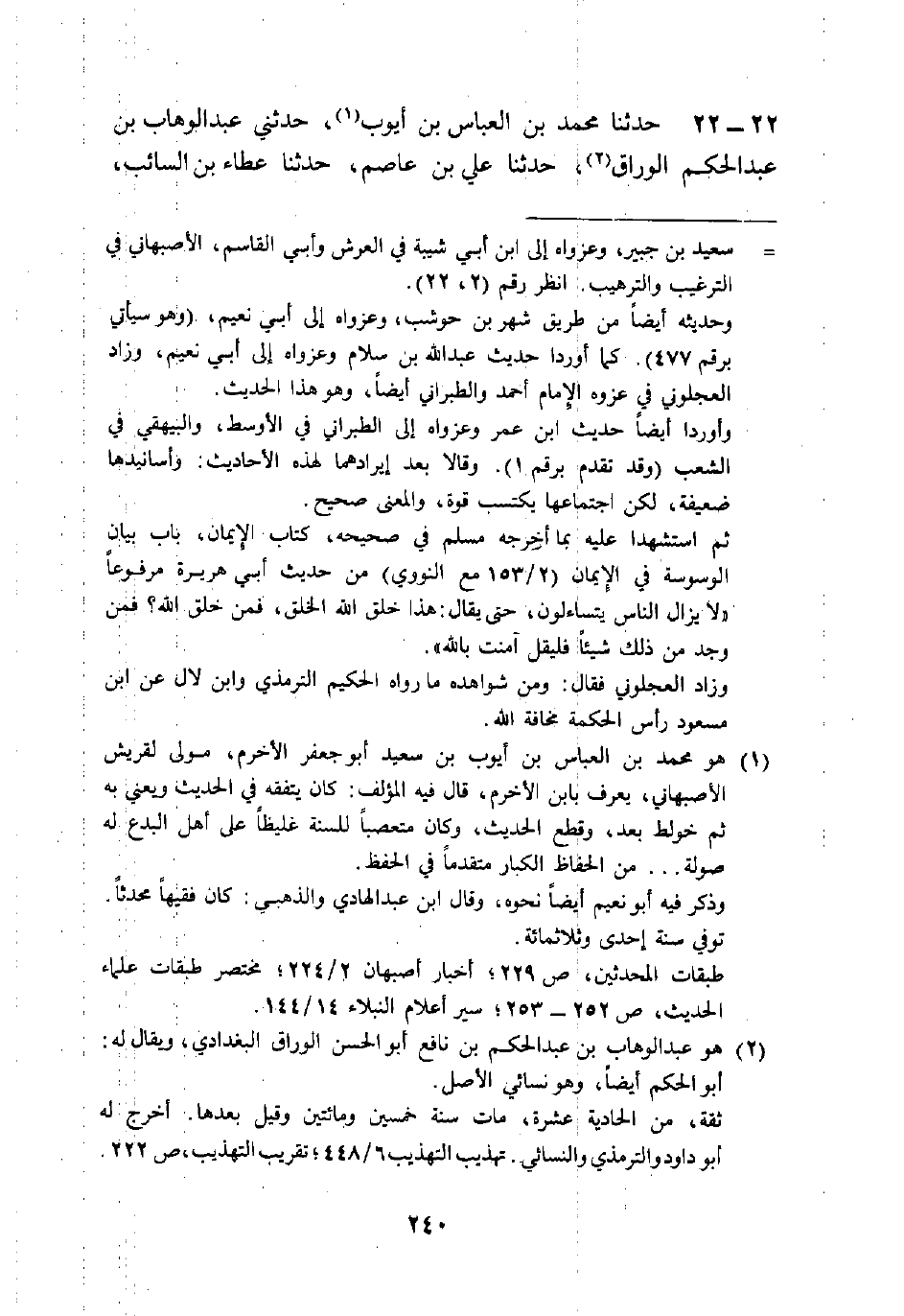 22 - حَدَّثَنَا مُحَمَّدُ بْنُ الْعَبَّاسِ بْنِ أَيُّوبَ، حَدَّثَنِي عَبْدُ الْوَهَّابِ بْنُ عَبْدِ الْحَكَمِ الْوَرَّاقُ، حَدَّثَنَا عَلِيُّ بْنُ عَاصِمٍ، حَدَّثَنَا عَطَاءُ بْنُ السَّائِبِ -[241]-، عَنْ سَعِيدِ بْنِ جُبَيْرٍ، عَنِ ابْنِ عَبَّاسٍ رَضِيَ اللَّهُ عَنْهُمَا، قَالَ: «§فَكِّرُوا فِي كُلِّ شَيْءٍ، وَلَا تُفَكِّرُوا فِي ذَاتِ اللَّهِ تَعَالَى، فَإِنَّ مَا بَيْنَ كُرْسِيِّهِ إِلَى السَّمَاءِ السَّابِعَةِ سَبْعَةَ آلَافِ نُورٍ، وَهُوَ فَوْقَ ذَلِكَ تَبَارَكَ وَتَعَالَى»