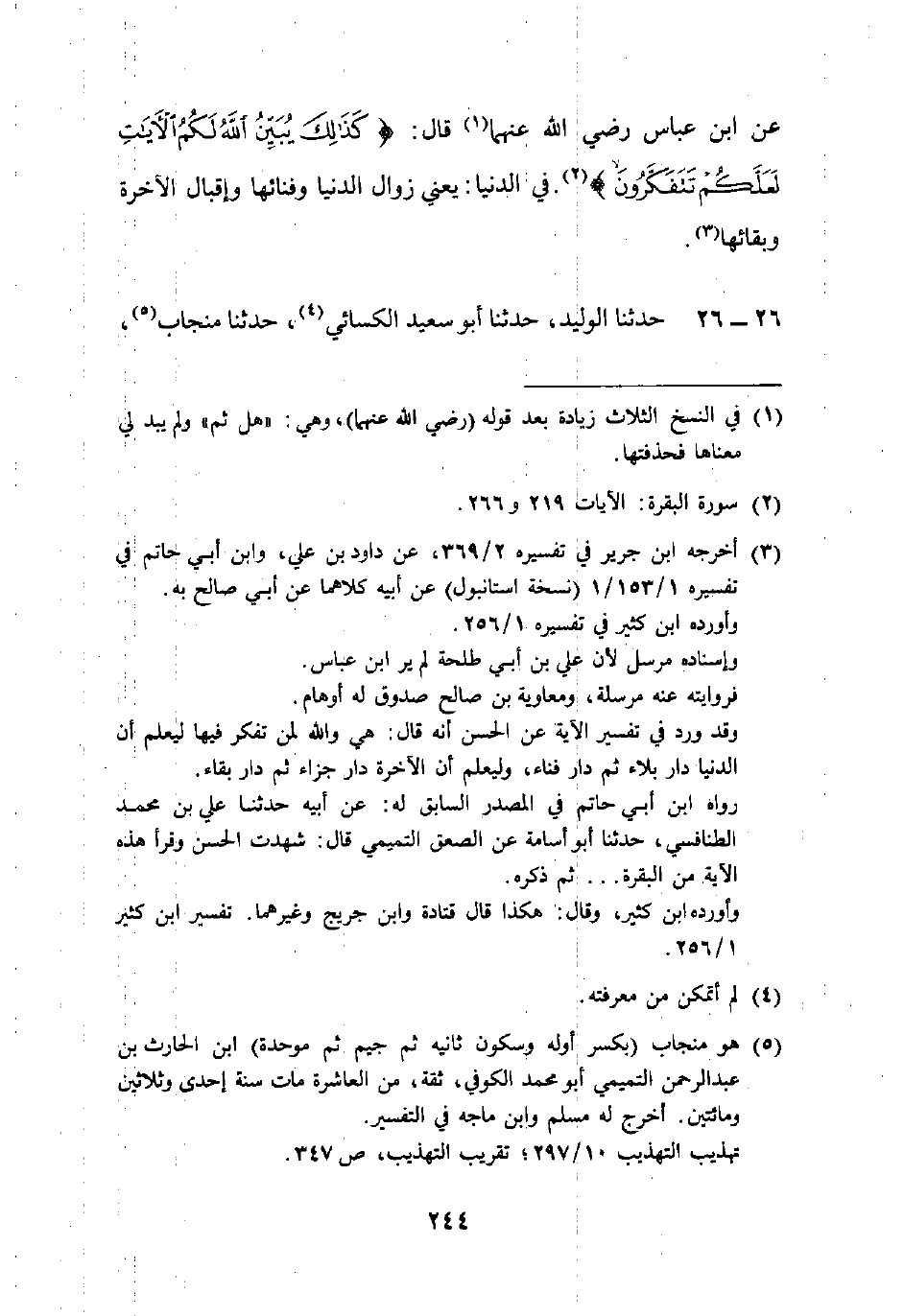 26 - حَدَّثَنَا الْوَلِيدُ، حَدَّثَنَا أَبُو سَعِيدٍ الْكِسَائِيُّ، حَدَّثَنَا مِنْجَابٌ -[245]-، أَخْبَرَنَا بِشْرٌ، عَنْ أَبِي رَوْقٍ، عَنِ الضَّحَّاكِ، عَنِ ابْنِ عَبَّاسٍ رَضِيَ اللَّهُ عَنْهُمَا، ثُمَّ قَالَ: {وَمَنْ كَانَ فِي هَذِهِ أَعْمَى} [الإسراء: 72] ، يَقُولُ: §مَنْ كَانَ فِي الدُّنْيَا أَعْمَى عَمَّا يَرَى مِنْ قُدْرَتِي مِنْ خَلْقِ السَّمَاءِ وَالْأَرْضِ وَالْجِبَالِ وَالْبِحَارِ وَالنَّاسِ وَالدَّوَابِّ، وَأَشْبَاهِ هَذَا، فَهُوَ عَمَّا وَصَفْتُ لَهُ فِي الْآخِرَةِ وَلَمْ يَرَهُ أَعْمَى وَأَضَلُّ سَبِيلًا يَقُولُ: وَأَبْعَدُ حُجَّةً "