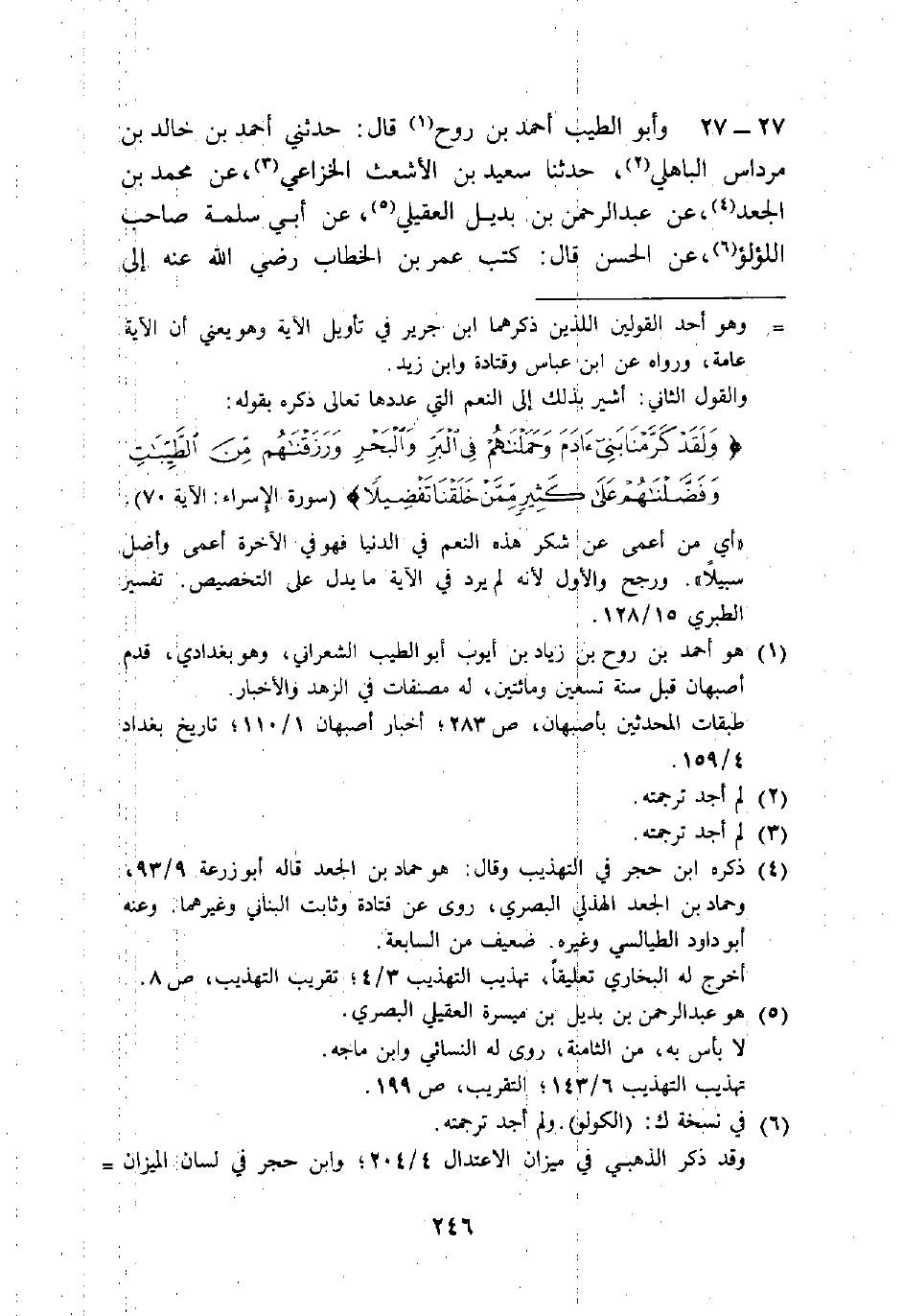 27 - وَأَبُو الطَّيِّبِ أَحْمَدُ بْنُ رَوْحٍ، قَالَ: حَدَّثَنِي أَحْمَدُ بْنُ خَالِدِ بْنِ مِرْدَاسٍ الْبَاهِلِيُّ، حَدَّثَنَا سَعِيدُ بْنُ الْأَشْعَثِ الْخُزَاعِيُّ، عَنْ مُحَمَّدِ بْنِ الْجَعْدِ، عَنْ عَبْدِ الرَّحْمَنِ بْنِ بُدَيْلٍ الْعُقَيْلِيِّ، عَنْ أَبِي سَلَمَةَ صَاحِبِ اللُّؤْلُؤِ، عَنِ الْحَسَنِ، قَالَ: كَتَبَ عُمَرُ بْنُ الْخَطَّابِ رَضِيَ اللَّهُ عَنْهُ، إِلَى -[247]- أَبِي مُوسَى الْأَشْعَرِيِّ رَضِيَ اللَّهُ عَنْهُ: " §وَإِذَا أَحْبَبْتَ أَنْ تَحْقِرَ عَمَلَكَ، فَتَفَكَّرْ فِيمَا أَنْعَمَ اللَّهُ عَلَيْكَ، وَقَدِّرْ مَا عَمِلَ الصَّالِحُونَ قَبْلَكَ، وَقَدِّرْ عُقُوبَتَهُ فِي الذُّنُوبِ، إِنَّمَا فُعِلَ بِآدَمَ الَّذِي فُعِلَ بِأُكْلَةٍ أَكَلَهَا، فَقَالَ: {وَعَصَى آدَمُ رَبَّهُ فَغَوَى} [طه: 121] ، وَإِنَّمَا لَعَنَ إِبْلِيسَ وَجَعَلَهُ شَيْطَانًا رَجِيمًا مِنْ أَجْلِ سَجْدَةٍ أَبَى أَنْ يَسْجُدَهَا، وَجَعَلَ مِنْهُمْ قِرَدَةً وَخَنَازِيرَ مِنْ أَجْلِ حِيتَانٍ أَصَابُوهَا يَوْمَ السَّبْتِ، وَقَدْ نُهُوا أَنْ يَعْدُوا فِيهِ، فَتَفَكَّرْ فِي نَعِيمِ الْجَنَّةِ، وَمُلْكِهَا وَكَرَامَتِهَا، فَإِذَا فَكَّرْتَ فِي هَذَا كُلِّهِ عَرَفْتَ نَفْسَكَ، وَحَقَرْتَ عَمَلَكَ، وَعَلِمْتَ أَنَّ عَمَلَكَ لَنْ يُغْنِيَ عَنْكَ شَيْئًا إِلَّا أَنْ يَتَغَمَّدَكَ اللَّهُ بِرَحْمَتِهِ، وَبِعَفْوِهِ "