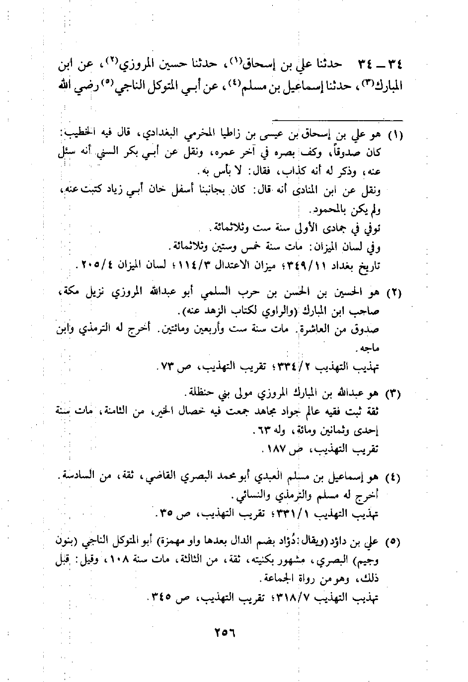 34 - حَدَّثَنَا عَلِيُّ بْنُ إِسْحَاقَ، حَدَّثَنَا حُسَيْنٌ الْمَرْوَزِيُّ، عَنِ ابْنِ الْمُبَارَكِ، حَدَّثَنَا إِسْمَاعِيلُ بْنُ مُسْلِمٍ، عَنْ أَبِي الْمُتَوَكِّلِ النَّاجِيِّ رَضِيَ اللَّهُ -[257]- عَنْهُ، أَنَّ نَبِيَّ اللَّهِ صَلَّى اللهُ عَلَيْهِ وَسَلَّمَ §«قَامَ ذَاتَ لَيْلَةٍ بِآيَةٍ مِنَ الْقُرْآنِ يُكَرِّرُهَا عَلَى نَفْسِهِ»