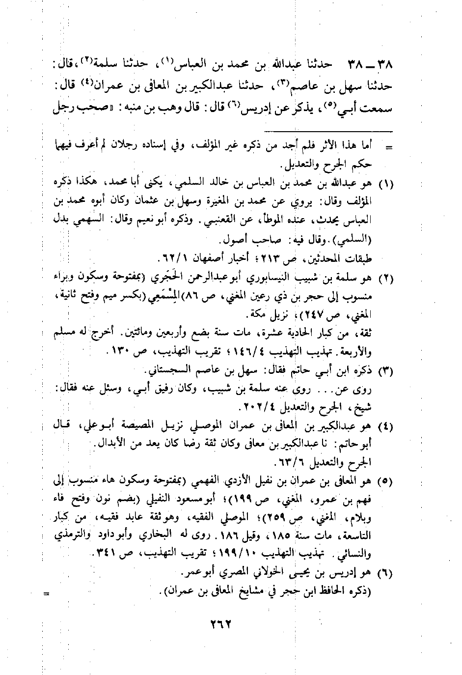 38 - حَدَّثَنَا عَبْدُ اللَّهِ بْنُ مُحَمَّدِ بْنِ الْعَبَّاسِ، حَدَّثَنَا سَلَمَةُ، قَالَ: حَدَّثَنَا سَهْلُ بْنُ عَاصِمٍ، حَدَّثَنَا عَبْدُ الْكَبِيرِ بْنُ الْمُعَافَى بْنِ عِمْرَانَ، قَالَ: سَمِعْتُ أَبِي يَذْكُرُ، عَنْ إِدْرِيسَ، قَالَ: قَالَ وَهْبُ بْنُ مُنَبِّهٍ: " §صَحِبَ رَجُلٌ -[263]- عَابِدًا مِنْ عُبَّادِ بَنِي إِسْرَائِيلَ، فَلَمَّا أَرَادَ أَنْ يُفَارِقَهُ، قَالَ: إِنَّ لِي عَلَيْكَ حَقًّا، قَالَ: سَلْ حَقَّكَ، قَالَ: أَوْصِنِي، قَالَ: عَلَيْكَ الِاعْتِبَارَ فِي الدُّنْيَا، فَإِنَّهُ يُرِقُّ لَكَ قَلْبَكَ، وَيُعَظِّمُ لَكَ بِاعْتِبَارِهَا الْفِكْرَةَ، فَإِنَّ الْقَلْبَ إِذَا رَقَّ انْفَتَحَ، فَوَعَى، وَإِنَّ اعْتِبَارَكَ سَاعَةً خَيْرٌ مِنْ عِبَادَةِ سَنَةٍ، وَتَفَكُّرٌ طَرْفَةَ عَيْنٍ خَيْرٌ مِنْ عِبَادَةِ حِينٍ مِنَ الدَّهْرِ "