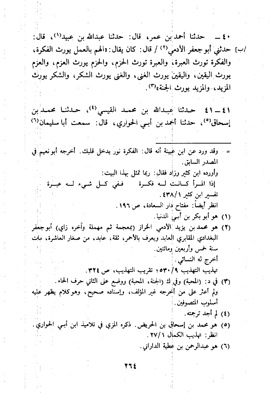 40 - حَدَّثَنَا أَحْمَدُ بْنُ عُمَرَ، قَالَ: حَدَّثَنَا عَبْدُ اللَّهِ بْنُ عُبَيْدٍ، قَالَ: حَدَّثَنِي أَبُو جَعْفَرٍ الْأَدَمِيُّ، قَالَ: كَانَ يُقَالُ «§الْهَمُّ بِالْعَمَلِ يُورِثُ الْفِكْرَةَ، وَالْفِكْرَةُ تُوَرِّثُ الْعِبْرَةَ، وَالْعِبْرَةُ تُورِثُ الْحَزْمَ، وَالْحَزْمُ يُورِثُ الْعَزْمَ، وْالْعَزْمُ يُورِثُ الْيَقِينَ، وَالْيَقِينُ يُوَرِثُ الْغِنَى، وَالْغِنَى يُوَرِثُ الشُّكْرَ، وَالشُّكْرُ يُورِثُ الْمَزِيدَ، وَالْمَزِيدُ يُورِثُ الْجَنَّةَ»