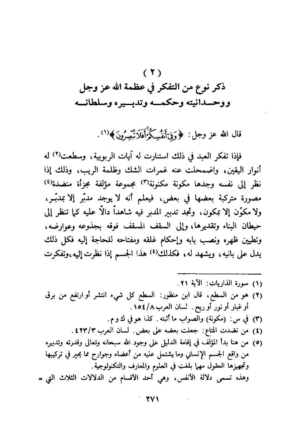 §ذِكْرُ نَوْعٍ مِنَ التَّفَكُّرِ فِي عَظَمَةِ اللَّهِ عَزَّ وَجَلَّ، وَوَحْدَانِيَّتِهِ، وَحُكْمِهِ، وَتَدْبِيرِهِ، وَسُلْطَانِهِ قَالَ اللَّهُ عَزَّ وَجَلَّ {وَفِي أَنْفُسِكُمْ أَفَلَا تُبْصِرُونَ} [الذاريات: 21] فَإِذَا تَفَكَّرَ الْعَبْدُ فِيِ ذَلِكَ اسْتَنَارَتْ لَهُ آيَاتُ الرُّبُوبِيَّةِ، وَسَطَعَتْ لَهُ أَنْوَارُ الْيَقِينِ، وَاضْمَحَلَّتْ عَنْهُ غَمَرَاتُ الشَّكِّ، وَظُلْمَةُ الرَّيْبِ، وَذَلِكَ إِذَا نَظَرَ إِلَى نَفْسِهِ وَجَدَهَا مُكَوَّنَةً مَكْنُونَةً مَجْمُوعَةً مُؤَلَّفَةً مَجْزَأَةً مُنَضَّدَةً مُصَوَّرَةً مُتَرَكِّبَةً بَعْضُهَا فِي بَعْضٍ، فَيَعْلَمُ أَنَّهُ لَا يُوجَدُ مُدَبَّرٌ إِلَّا بِمُدَبِّرٍ، وَلَا مُكَوَّنٌ إِلَّا بِمُكَوِّنٍ، وَتَجِدُ تَدْبِيرَ الْمُدِبِّرِ فِيهِ شَاهِدًا دَالًّا عَلَيْهِ كَمَا تَنْظُرُ إِلَى حِيطَانِ الْبِنَاءِ، وَتَقْدِيرِهَا "، وَإِلَى السَّقْفِ الْمُسَقَّفِ فَوْقَهُ بِجُذُوعِهِ، وَعَوَارِضِهِ، وَتَطْيِينِ ظَهْرِهِ، وَنَصْبِ بَابِهِ، وَإِحْكَامِ غَلْقِهِ، وَمِفْتَاحِهِ لِلْحَاجَةِ إِلَيْهِ. فَكُلُّ ذَلِكَ يَدُلُّ عَلَى بَانِيهِ، وَيَشْهَدُ لَهُ، فَكَذَلِكَ هَذَا الْجِسْمُ إِذَا نَظَرْتَ إِلَيْهِ، وَتَفَكَّرْتَ