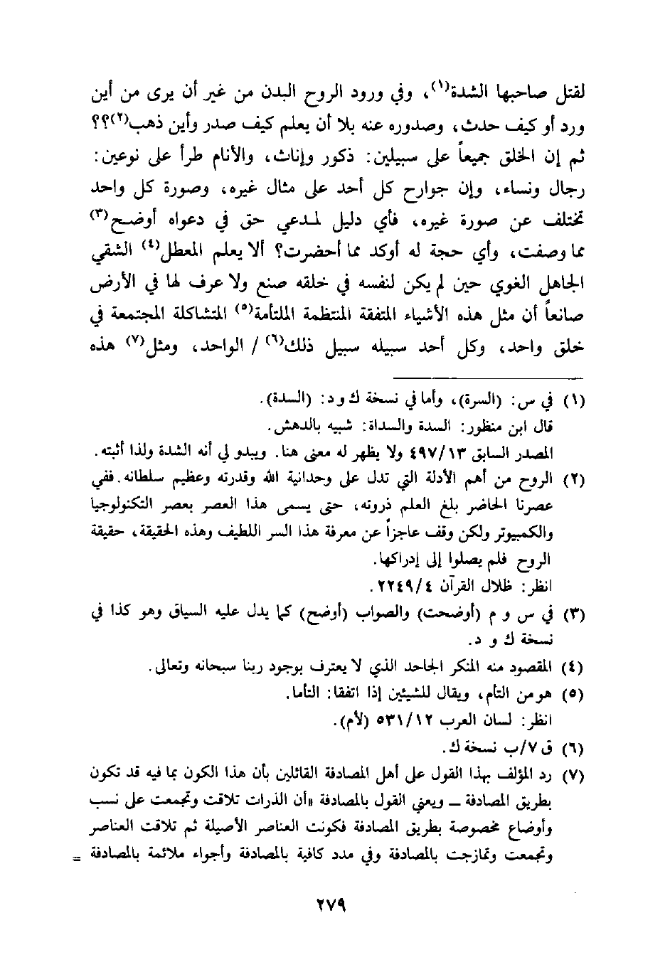 لَقَتَلَ صَاحِبَهَا الشِّدَّةُ، وَفِي وُرُودِ الرُّوحِ الْبَدَنَ مِنْ غَيْرِ أَنْ يُرَى مِنْ أَيْنَ وَرَدَ؟ أَوْ كَيْفَ حَدَثَ؟ وَصُدُورِهِ عَنْهُ بِلَا أَنْ يُعْلَمَ كَيْفَ صَدَرَ؟ وَأَيْنَ ذَهَبَ؟ ثُمَّ إِنَّ الْخَلْقَ جَمِيعًا عَلَى سَبِيلَيْنِ ذُكُورٍ وَإِنَاثٍ، وَالْأَنَامُ طُرًّا عَلَى نَوْعَيْنِ: رِجَالٍ وَنِسَاءٍ، وَإِنَّ جَوَارِحَ كُلِّ أَحَدٍ عَلَى مِثَالِ غَيْرِهِ، وَصُورَةَ كُلِّ وَاحِدٍ تَخْتَلِفُ عَنْ صُورَةِ غَيْرِهِ، فَأَيُّ دَلِيلٍ لِمُدَّعِي حَقٍّ فِي دَعْوَاهُ أَوْضَحُ مِمَّا وَصَفْتُ؟ وَأَيُّ حُجَّةٍ لَهُ أَوْكَدُ مِمَّا أَحَضَرْتُ؟ أَلَا يَعْلَمُ الْمُعَطِّلُ الشَّقِيُّ الْجَاهِلُ الَغَوِيُّ حِينَ لَمْ يَكُنْ لِنَفْسِهِ فِي خَلْقِهِ صُنْعٌ، وَلَا عَرَفَ لَهَا فِي الْأَرْضِ صَانِعًا أَنَّ مِثْلَ هَذِهِ الْأَشْيَاءِ الْمُتَّفِقَةِ الْمُنْتَظِمَةِ الْمُلْتَأَمَةِ الْمُتَشَاكِلَةِ الْمُجْتَمِعَةِ فِي خَلْقٍ وَاحِدٍ، وَكُلُّ أَحَدٍ سَبِيلُهُ سَبِيلُ ذَلِكَ الْوَاحِدِ، وَمَثَلُ هَذِهِ
