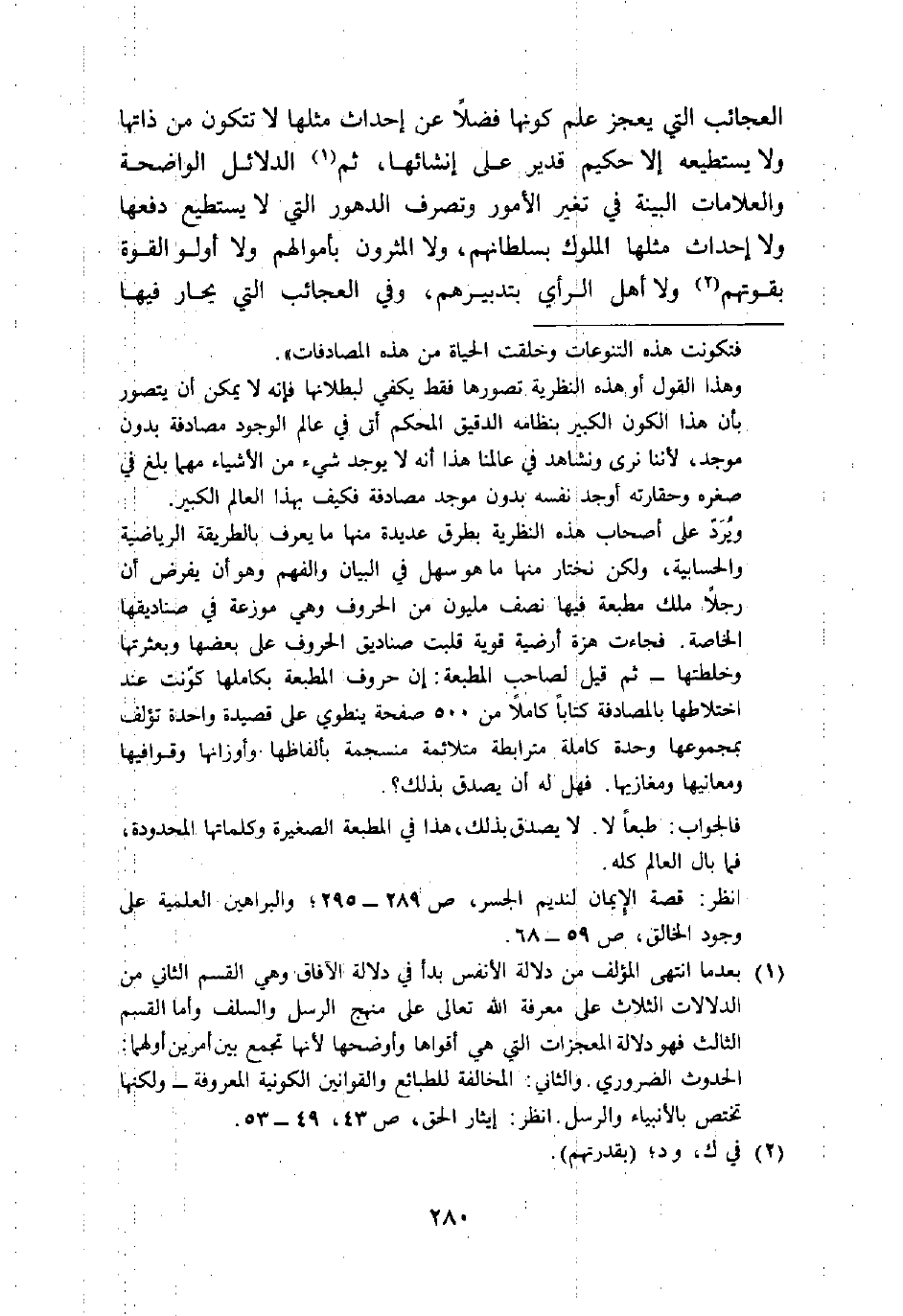 الْعَجَائِبِ الَّتِي يُعْجِزُ عِلْمُ كَوْنِهَا فَضْلًا عَنْ إِحْدَاثِ مِثْلِهَا لَا تَتَكَوَّنُ مِنْ ذَاتِهَا، وَلَا يَسْتَطِيعُهُ إِلَّا حَكِيمٌ قَدِيرٌ عَلَى إِنْشَائِهَا، ثُمَّ الدَّلَائِلُ الْوَاضِحَةُ، وَالْعَلَامَاتُ الْبَيِّنَةُ فِي تَغَيُّرِ الْأُمُورِ وَتَصَرُّفِ الدُّهُورِ الَّتِي لَا يَسْتَطِيعُ دَفْعَهَا، وَلَا إِحْدَاثَ مِثْلِهَا الْمُلُوكُ بِسُلْطَانِهِمْ، وَلَا الْمُثْرُونَ بِأَمْوَالِهِمْ، وَلَا أُولُو الْقُوَّةِ بِقُوَّتِهِمْ، وَلَا أَهْلُ الرَّأْي بِتَدْبِيرِهِمْ، وَفِي الْعَجَائِبِ الَّتِي يَحَارُ فِيهَا