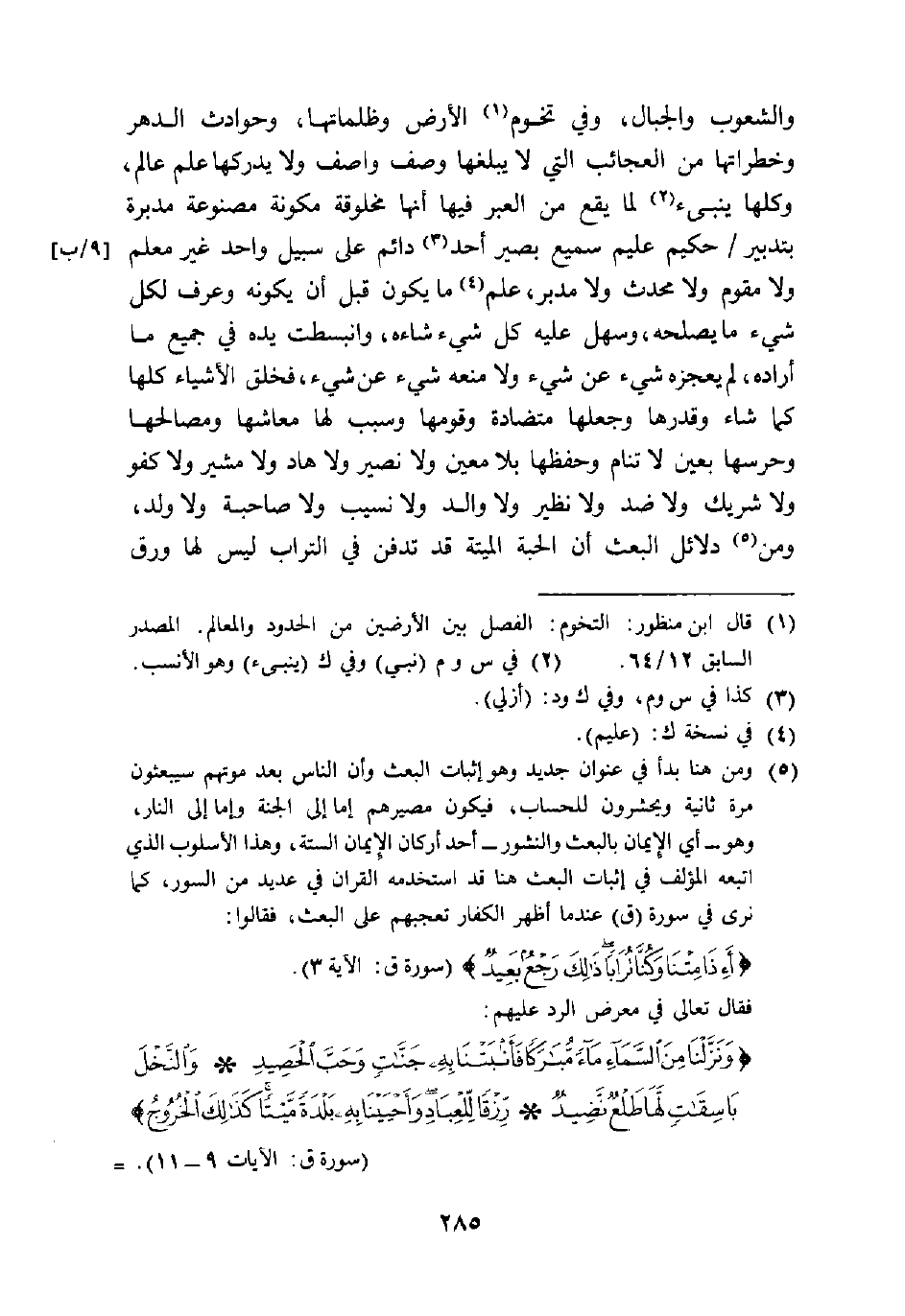، وَالشُّعُوبِ وَالْجِبَالِ، وَفِي تُخُومِ الْأَرْضِ وَظُلُمَاتِهَا وَحَوَادِثِ الدَّهْرِ وَخَطَرَاتِهَا مِنَ الْعَجَائِبِ الَّتِي لَا يَبْلُغُهَا وَصْفُ وَاصِفٍ، وَلَا يُدْرِكُهَا عِلْمُ عَالِمٍ، وَكُلُّهَا يُنْبِئُ لِمَا يَقَعُ مِنَ الْعِبَرِ فِيهَا أَنَّهَا مَخْلُوقَةٌ مُكَوَّنَةٌ مَصْنُوعَةٌ مُدَبَّرَةٌ بِتَدْبِيرِ حَكِيمٍ عَلِيمٍ سَمِيعٍ بَصِيرٍ أَحَدٍ دَائِمٍ عَلَى سَبِيلٍ وَاحِدٍ، غَيْرِ مُعَلَّمٍ وَلَا مُقَوَّمٍ وَلَا مُحْدَثٍ وَلَا مُدَبَّرٍ، عَلِمَ مَا يَكُونُ قَبْلَ أَنْ يُكَوِّنَهُ، وَعَرَفَ لِكُلِّ شَيْءٍ مَا يُصْلِحُهُ، وَسَهَّلَ عَلَيْهِ كُلَّ شَيْءٍ شَاءَهُ، وَانْبَسَطَتْ يَدُهُ فِي جَمِيعِ مَا أَرَادَهُ لَمْ يُعْجِزْهُ شَيْءٌ عَنْ شَيْءٍ، وَلَا مَنَعَهُ شَيْءٌ عَنْ شَيْءٍ، فَخَلَقَ الْأَشْيَاءَ كُلَّهَا كَمَا شَاءَ، وَقَدَّرَهَا، وَجَعَلَهَا مُتَضَادَّةً، وَقَوَّمَهَا وَسَبَّبَ لَهَا مَعَاشَهَا وَمَصَالِحَهَا، وَحَرَسَهَا بِعَيْنٍ لَا تَنَامُ وَحَفِظَهَا بِلَا مُعِينٍ، وَلَا نَصِيرٍ، وَلَا هَادٍ، وَلَا مُشِيرٍ، وَلَا كُفْوٍ، وَلَا شَرِيكٍ، وَلَا ضِدٍّ، وَلَا نَظِيرٍ، وَلَا وَالِدٍ، وَلَا نَسِيبٍ، وَلَا صَاحِبَةٍ، وَلَا وَلَدٍ، وَمِنْ دَلَائِلِ الْبَعْثِ أَنَّ الْحَبَّةَ الْمَيِّتَةَ قَدْ تُدْفَنُ فِي التُّرَابِ لَيْسَ لَهَا وَرَقٌ