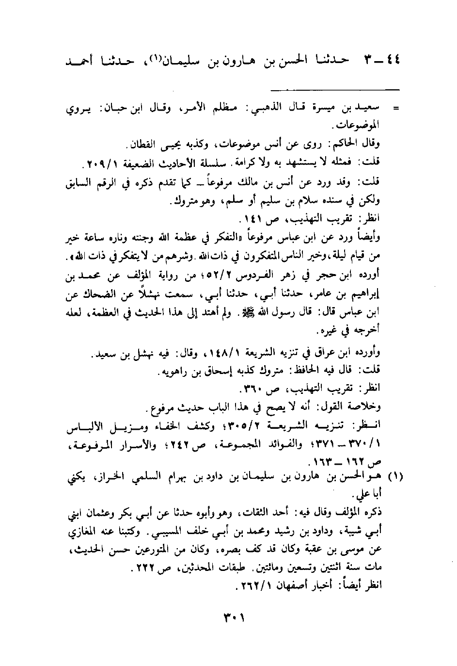44 - حَدَّثَنَا الْحَسَنُ بْنُ هَارُونَ بْنِ سُلَيْمَانَ، حَدَّثَنَا أَحْمَدُ -[302]- الدَّوْرَقِيُّ، حَدَّثَنَا مُحَمَّدُ بْنُ كَثِيرٍ، عَنْ أَبِي إِسْحَاقَ، عَنْ عَطَاءِ بْنِ السَّائِبِ، عَنْ سَعِيدِ بْنِ جُبَيْرٍ، عَنِ ابْنِ عَبَّاسٍ رَضِيَ اللَّهُ عَنْهُمَا، قَالَ: «§رَكْعَتَانِ مُقْتَصِدَتَانِ، فِيهِمَا تَفَكُّرٌ خَيْرٌ مِنْ قِيَامِ لَيْلَةٍ، وَالْقَلْبُ سَاهٍ»