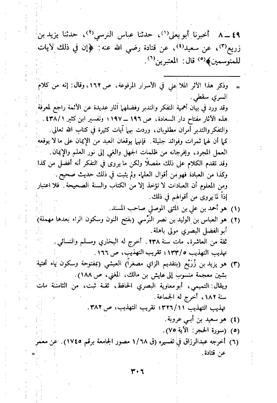 49 - أَخْبَرَنَا أَبُو يَعْلَى، حَدَّثَنَا عَبَّاسٌ النَّرْسِيُّ، حَدَّثَنَا يَزِيدُ بْنُ زُرَيْعٍ، عَنْ سَعِيدٍ، عَنْ قَتَادَةَ رَضِيَ اللَّهُ عَنْهُ: {§إِنَّ فِي ذَلِكَ لَآيَاتٍ لِلْمُتَوَسِّمِينَ} [الحجر: 75] . قَالَ: الَمُعْتَبِرِينَ