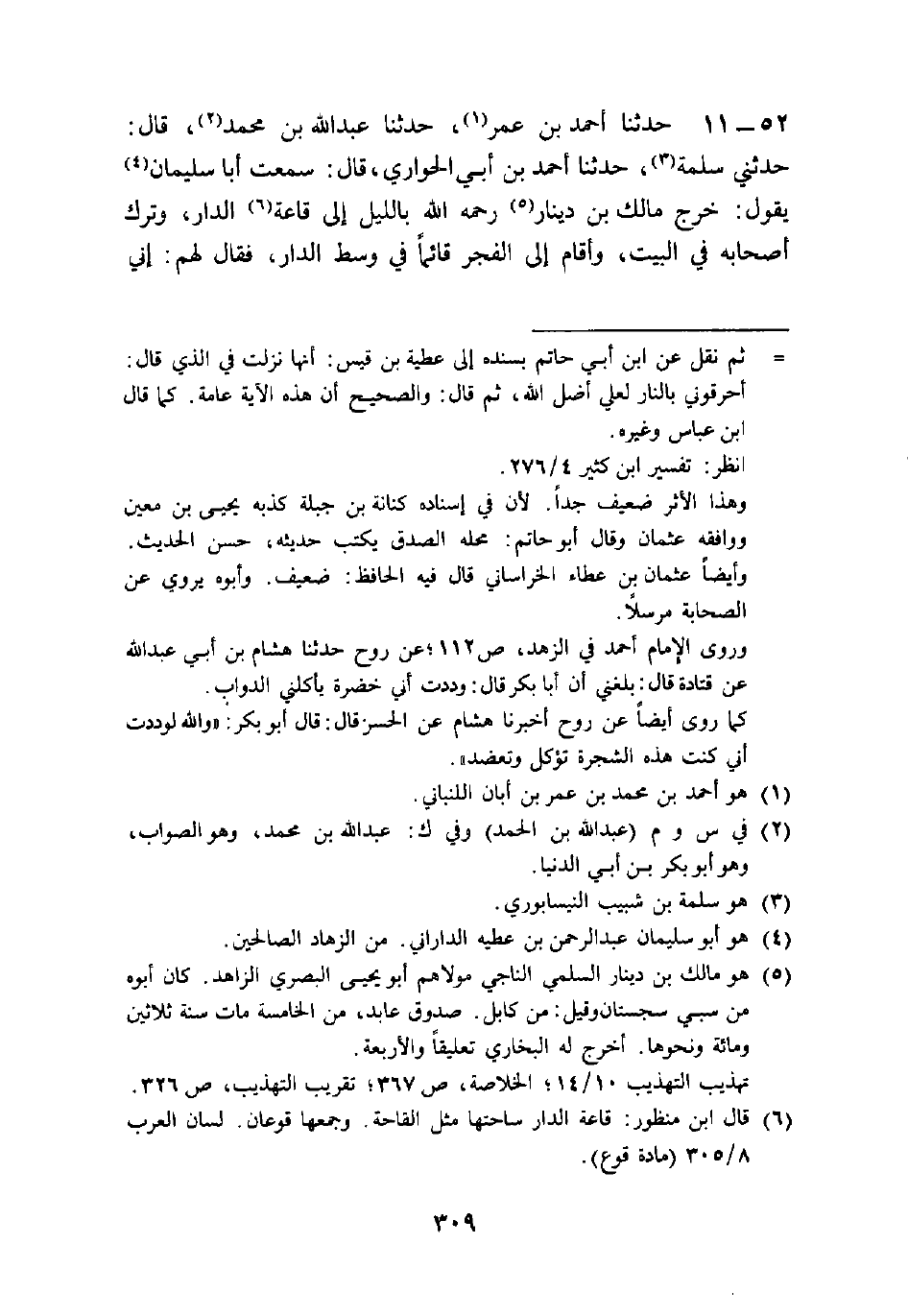 52 - حَدَّثَنَا أَحْمَدُ بْنُ عُمَرَ، حَدَّثَنَا عَبْدُ اللَّهِ بْنُ مُحَمَّدٍ قَالَ: حَدَّثَنِي سَلَمَةُ، حَدَّثَنَا أَحْمَدُ بْنُ أَبِي الْحَوَارِيِّ قَالَ: سَمِعْتُ أَبَا سُلَيْمَانَ يَقُولُ: " خَرَجَ مَالِكُ بْنُ دِينَارٍ رَحِمَهُ اللَّهُ بِاللَّيْلِ إِلَى قَاعِةِ الدَّارِ، وَتَرَكَ أَصْحَابَهُ فِي الْبَيْتِ، وَأَقَامَ إِلَى الْفَجْرِ قَائِمًا فِي وَسَطِ الدَّارِ، فَقَالَ لَهُمْ: إِنِّي -[310]- كُنْتُ فِي وَسَطِ الدَّارِ خَطَرَ بِبَالِي أَهْلُ النَّارِ، §فَلَمْ يَزَالُوا يُعْرَضُونَ عَلَيَّ بِسَلَاسِلِهِمْ وَأَغْلَالِهِمْ، حَتَّى الصَّبَاحِ.