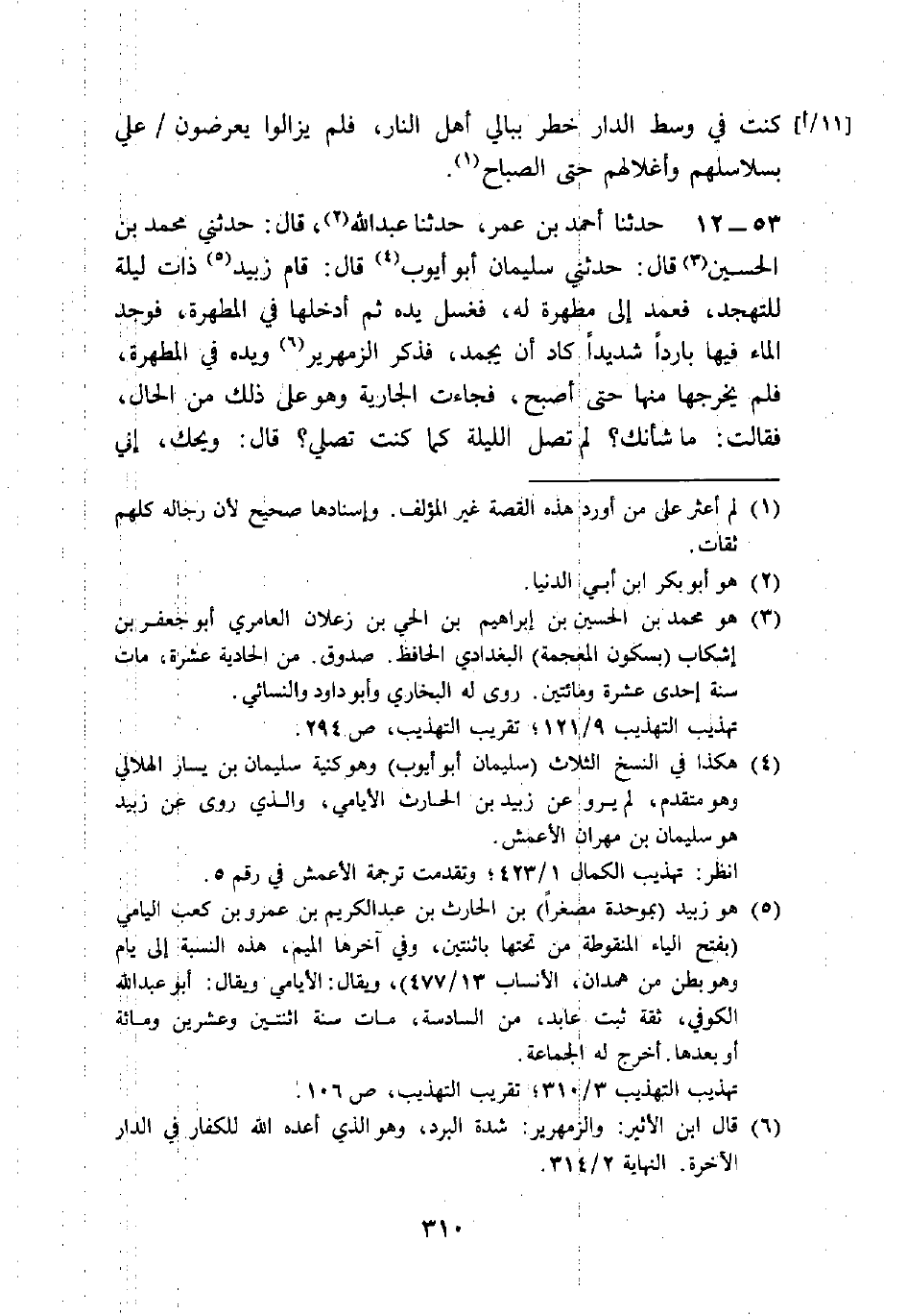 53 - حَدَّثَنَا أَحْمَدُ بْنُ عُمَرَ، حَدَّثَنَا عَبْدُ اللَّهِ قَالَ: حَدَّثَنِي مُحَمَّدُ بْنُ الْحُسَيْنِ، قَالَ: حَدَّثَنِي سُلَيْمَانُ أَبُو أَيُّوبَ قَالَ: §" قَامَ زُبَيْدٌ ذَاتَ لَيْلَةٍ لِلتَّهَجُّدِ، فَعَمَدَ إِلَى مَطْهَرَةٍ لَهُ، فَغَسَلَ يَدَهُ، ثُمَّ أَدْخَلَهَا فِي الْمَطْهَرَةِ، فَوَجَدَ الْمَاءَ فِيهَا بَارِدًا شَدِيدًا كَادَ أَنْ يَجْمُدَ، فَذَكَرَ الزَّمْهَرِيرَ، وَيَدُهُ فِي الْمَطْهَرَةِ، فَلَمْ يُخْرِجْهَا مِنْهَا حَتَّى أَصْبَحَ، فَجَاءَتِ الْجَارِيَةُ وَهُوَ عَلَى ذَلِكَ مِنَ الْحَالِ، فَقَالَتْ: مَا شَأْنُكُ؟ لَمْ تُصَلِّ اللَّيْلَةَ كَمَا كُنْتَ تُصَلِّي؟ قَالَ: وَيْحَكِ، إِنِّي -[311]- أَدْخَلْتُ يَدِي فِي هَذِهِ الْمَطْهَرَةِ فَاشْتَدَّ عَلَيَّ بَرْدُ الْمَاءِ، فَذَكَرْتُ بِهِ الزَّمْهَرِيرَ فَوَاللَّهِ , مَا شَعَرْتُ بِشِدَّةِ بَرْدِهِ عَلَيَّ حَتَّى وَقَفْتِ عَلَيَّ، انْظُرِي لَا تُخْبِرِي بِهَذَا أَحَدًا مَا دُمْتُ حَيًّا. قَالَ: فَمَا عَلِمَ بِذَلِكَ أَحَدٌ، حَتَّى مَاتَ رَحْمَةُ اللَّهِ عَلَيْهِ.