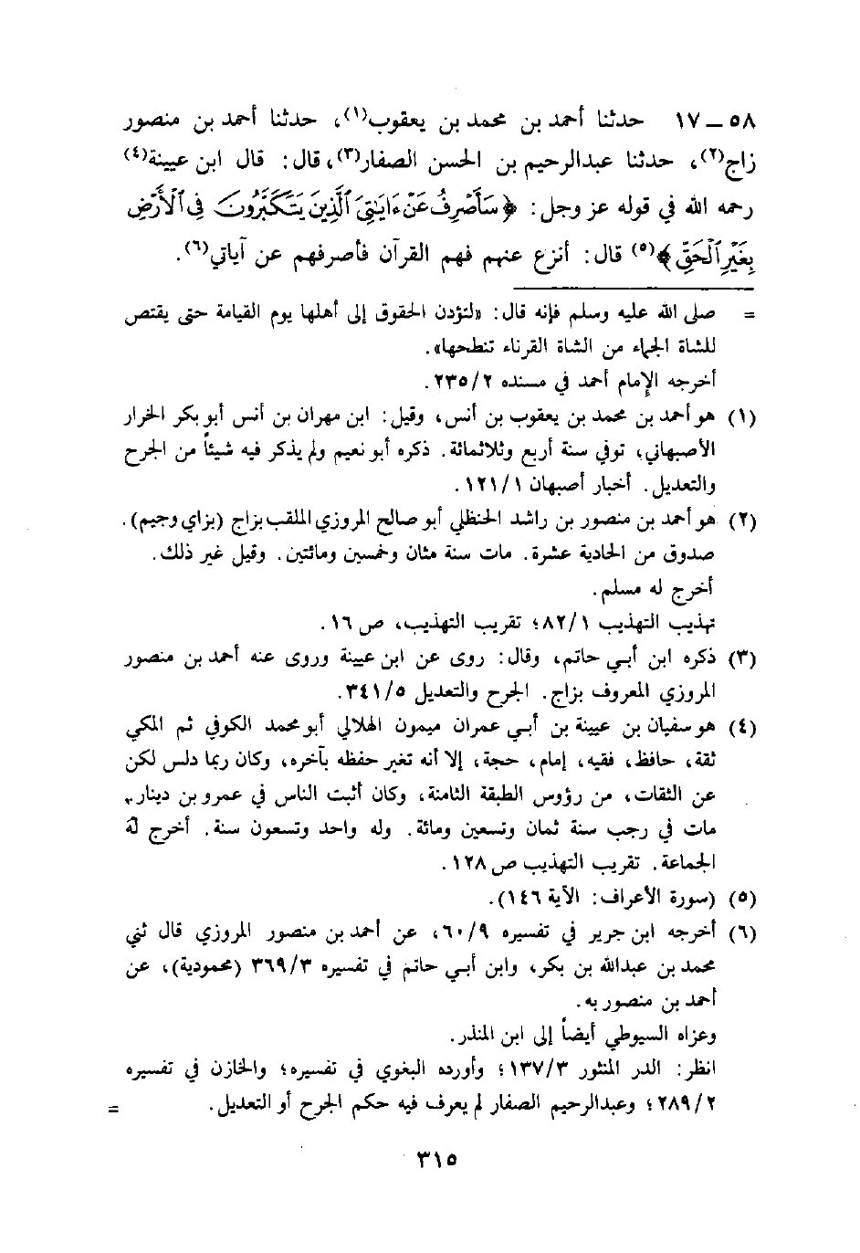 58 - حَدَّثَنَا أَحْمَدُ بْنُ مُحَمَّدِ بْنِ يَعْقُوبَ، حَدَّثَنَا أَحْمَدُ بْنُ مَنْصُورٍ زَاجٌّ، حَدَّثَنَا عَبْدُ الرَّحِيمِ بْنُ الْحَسَنِ الصَّفَّارُ قَالَ: قَالَ ابْنُ عُيَيْنَةَ رَحِمَهُ اللَّهُ فِي قَوْلِهِ عَزَّ وَجَلَّ: {سَأَصْرِفُ عَنْ آيَاتِيَ الَّذِينَ يَتَكَبَّرُونَ فِي الْأَرْضِ بِغَيْرِ الْحَقِّ} [الأعراف: 146] . قَالَ: " §أَنْزَعُ عَنْهُمْ فَهْمَ الْقُرْآنِ، فَأَصْرِفُهُمْ عَنْ آيَاتِي.
