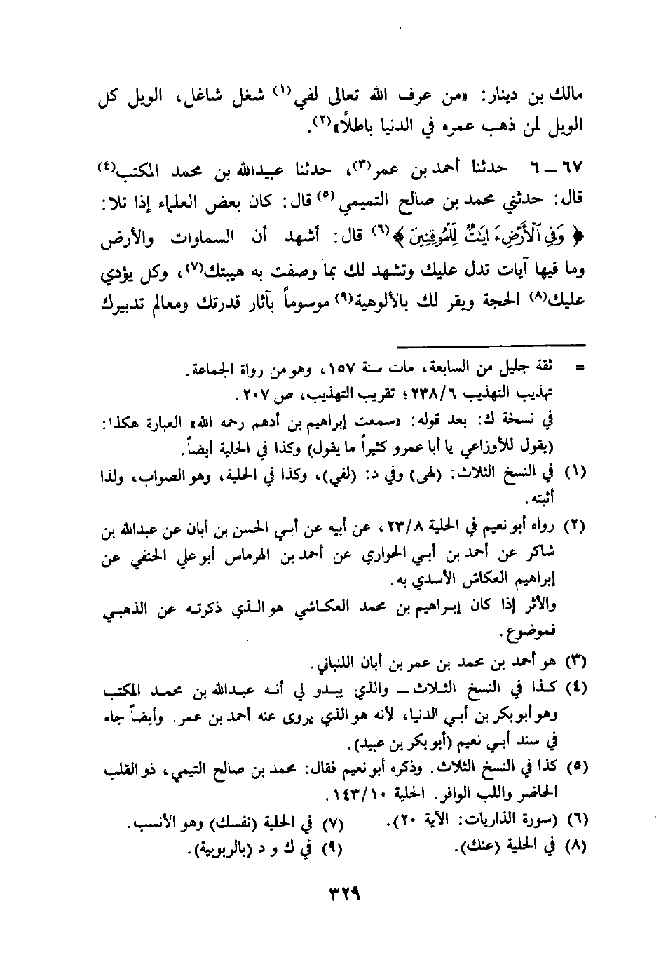 67 - حَدَّثَنَا أَحْمَدُ بْنُ عُمَرَ، حَدَّثَنَا عُبَيْدُ اللَّهِ بْنُ مُحَمَّدٍ الْمُكْتِبُ قَالَ: حَدَّثَنِي مُحَمَّدُ بْنُ صَالِحٍ التَّمِيمِيُّ، قَالَ: كَانَ بَعْضُ الْعُلَمَاءِ إِذَا تَلَا {وَفِي الْأَرْضِ آيَاتٌ لِلْمُوقِنِينَ} [الذاريات: 20] قَالَ: " §أَشْهَدُ أَنَّ السَّمَاوَاتِ وَالْأَرْضَ، وَمَا فِيهَا آيَاتٌ تَدُلُّ عَلَيْكَ، وَتَشْهَدُ لَكَ بِمَا وَصَفْتَ بِهِ هَيْبَتَكَ , وَكُلٌّ يُؤَدِّي عَلَيْكَ الْحُجَّةَ، وَيُقِرُّ لَكَ بِالْأُلُوهِيَّةِ مَوْسُومًا بِآثَارِ قُدْرَتِكَ، وَمَعَالِمِ تَدْبِيرِكَ -[330]- الَّذِي تَجَلَّيْتَ بِهِ لِخَلْقِكَ، فَوُسِمَتِ الْقُلُوبُ مِنْ مَعَرِفَتِكَ مَا آنَسَهَا مِنْ وَحْشَةِ الْفِكْرِ، وَكَفَاهَا رَحِمَ الِاحِتْجَابِ فَهِيَ عَلَى اعْتِرَافِهَا بِكَ شَاهِدَةٌ أَنَّكَ لَا تُحِيطُ بِكَ الصِّفَاتُ، وَلَا تُدْرِكُكَ الْأَوْهَامُ، وَأَنَّ حَظَّ الْمُتَفَكِّرِ فِيكَ الِاعْتِرَافُ بِكَ، وَالتَّوْحِيدُ لَكَ.
