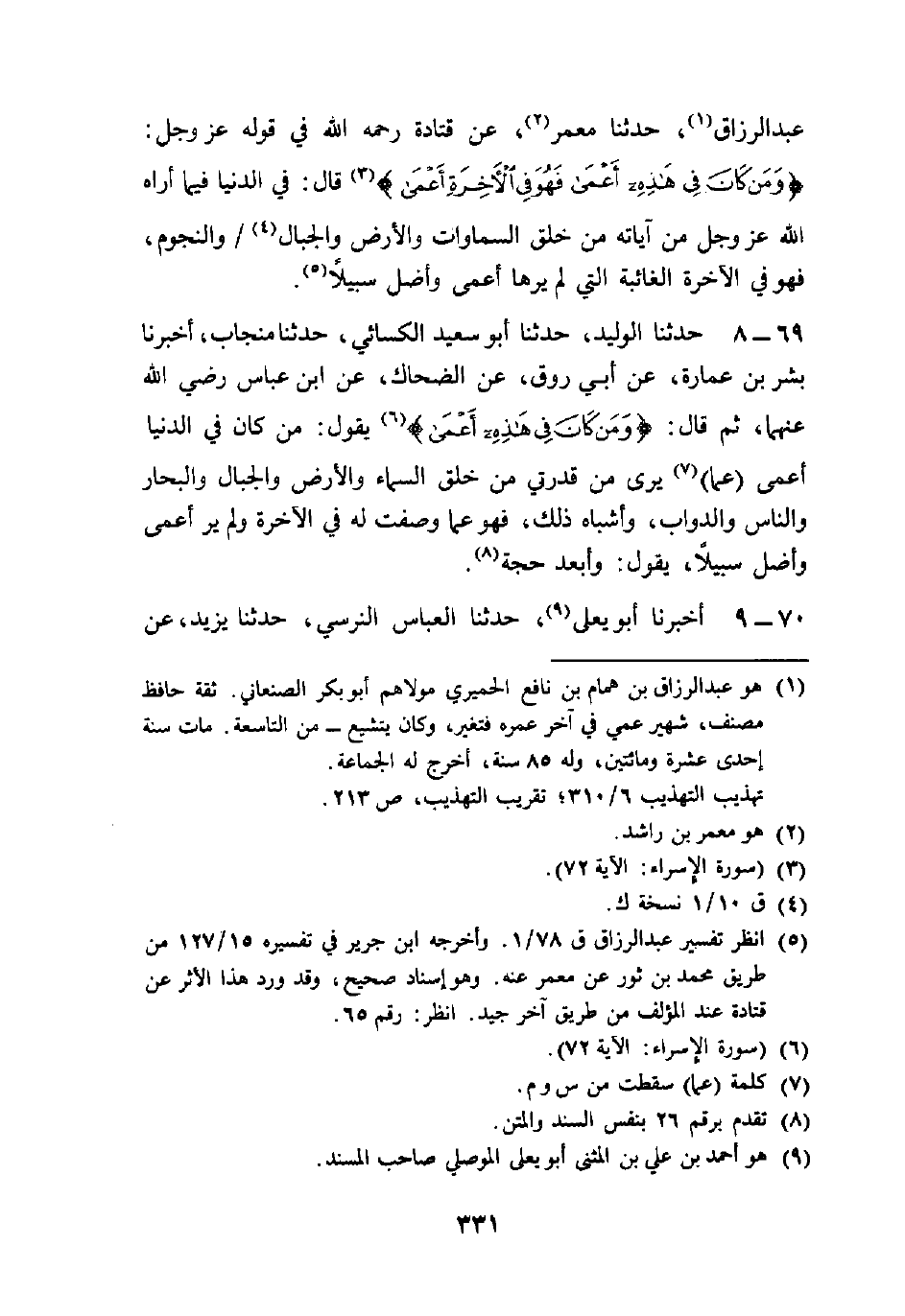 70 - أَخْبَرَنَا أَبُو يَعْلَى، حَدَّثَنَا الْعَبَّاسُ النَّرْسِيُّ، حَدَّثَنَا يَزِيدُ، عَنْ -[332]- سَعِيدٍ، عَنْ قَتَادَةَ رَضِيَ اللَّهُ عَنْهُ {§قُلْ هَلْ يَسْتَوِي الْأَعْمَى وَالْبَصِيرُ أَفَلَا تَتَفَكَّرُونَ} [الأنعام: 50] ، " وَالْأَعْمَى، الْكَافِرُ الَّذِي عَمِيَ عَنْ حَقِّ اللَّهِ عَزَّ وَجَلَّ، وَأَمْرِهِ، وَنِعَمِهِ عَلَيْهِ. وَالْبَصِيرُ، الْعَبْدُ الْمُؤْمِنُ الَّذِي أَبْصَرَ بَصَرًا نَافِعًا، وَوَحَّدَهُ، وَعَمِلَ بِطَاعَةِ رَبِّهِ عَزَّ وَجَلَّ، وَانْتَفَعَ بِمَا أَتَاهُ مِنَ اللَّهِ عَزَّ وَجَلَّ