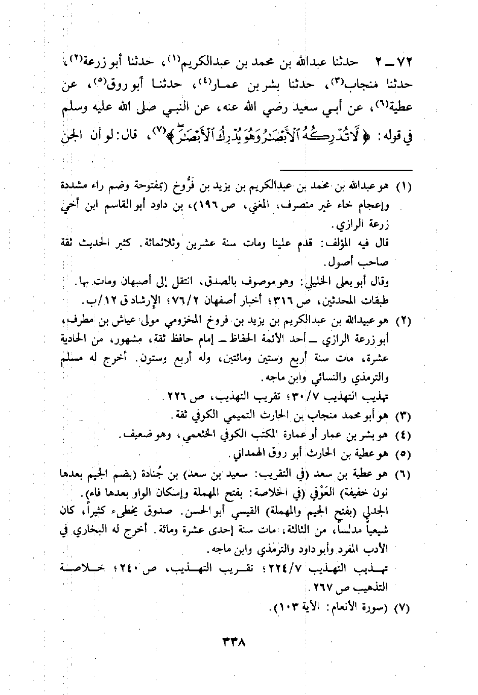 72 - حَدَّثَنَا عَبْدُ اللَّهِ بْنُ مُحَمَّدِ بْنِ عَبْدِ الْكَرِيمِ، حَدَّثَنَا أَبُو زُرْعَةَ، حَدَّثَنَا مِنْجَابٌ، حَدَّثَنَا بِشْرُ بْنُ عَمَّارٍ، حَدَّثَنَا أَبُو رَوْقٍ، عَنْ عَطِيَّةَ، عَنْ أَبِي سَعِيدٍ رَضِيَ اللَّهُ عَنْهُ، عَنِ النَّبِيِّ صَلَّى اللهُ عَلَيْهِ وَسَلَّمَ فِي قَوْلِهِ {لَا تُدْرِكُهُ الْأَبْصَارُ وَهُوَ يُدْرِكُ الْأَبْصَارَ} [الأنعام: 103] ، قَالَ: «§لَوْ أَنَّ الْجِنَّ -[339]- وَالْإِنْسَ، وَالشَّيَاطِينَ، وَالْمَلَائِكَةَ مُنْذُ خُلِقُوا إِلَى أَنْ فَنَوْا صُفُّوا صَفًّا وَاحِدًا مَا أَحَاطُوا بِاللَّهِ عَزَّ وَجَلَّ أَبَدًا»