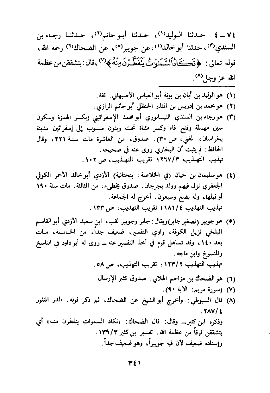 74 - حَدَّثَنَا الْوَلِيدُ، حَدَّثَنَا أَبُو حَاتِمٍ، حَدَّثَنَا رَجَاءُ بْنُ السِّنْدِيِّ، حَدَّثَنَا أَبُو خَالِدٍ، عَنْ جُوَيْبِرٍ، عَنِ الضَّحَّاكِ رَحِمَهُ اللَّهُ قَوْلَهُ تَعَالَى {§تَكَادُ السَّمَوَاتُ يَتَفَطَّرْنَ مِنْهُ} قَالَ: يَتَشَقَّقْنَ مِنْ عَظَمَةِ اللَّهِ عَزَّ وَجَلَّ
